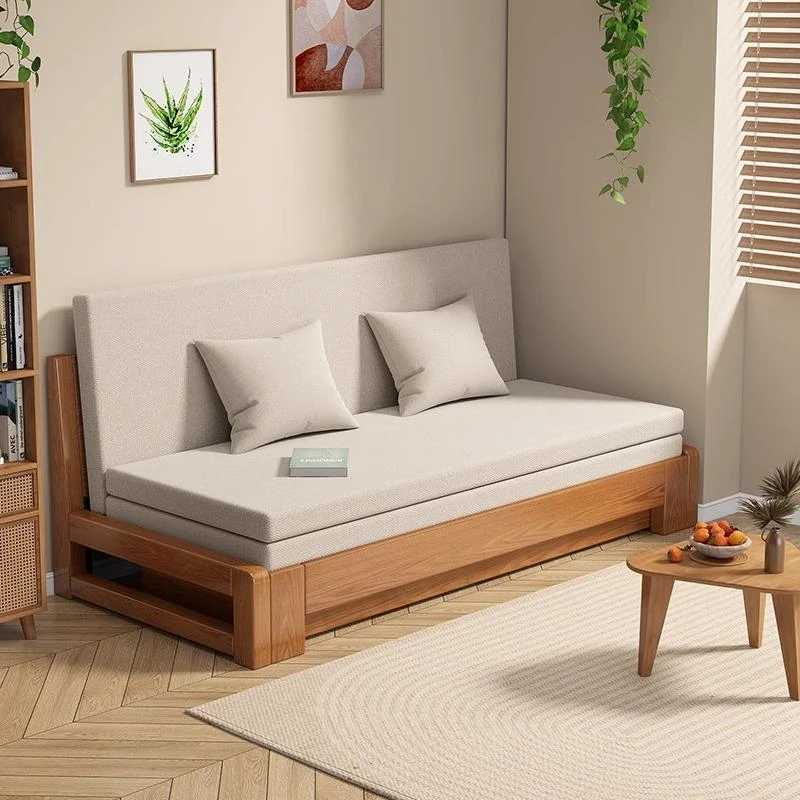 Modern Minimalist Solid Wood Luohan Sofa Bed – Space-Saving Pull-Out Bed for Small Living Rooms, Versatile Lounger with Coffee Table Function