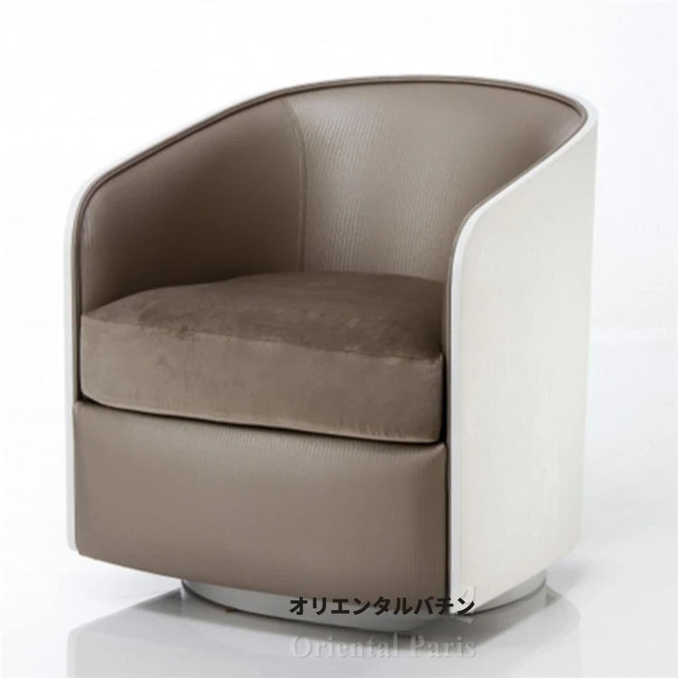 イタリアンラグジュアリーの別荘リビングにぴったり!コーヒーカラーの一人用レザー布アーチ型ソファ、カフェスタイルのサークルチェア、メタル脚の回転椅子。上質な空間を演出します!