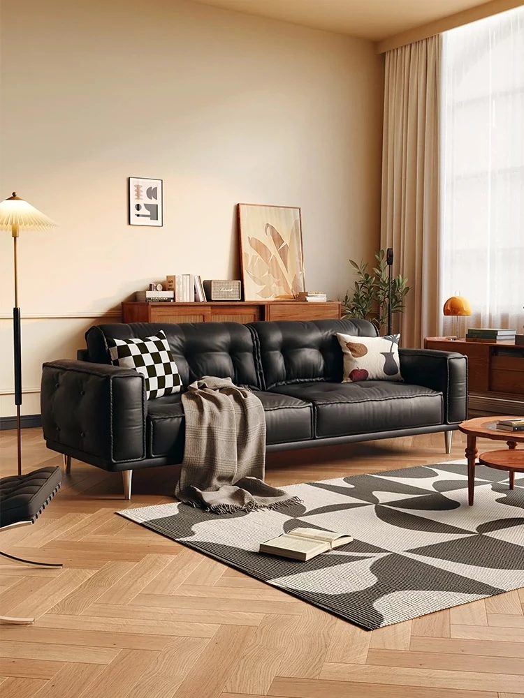 アメリカンヴィンテージ風 ブラックレザーソファ フレンチクリームカラーのレトロボタンデザイン リビングルーム用 小型北欧スタイル シンプルでスタイリッシュな直線デザイン