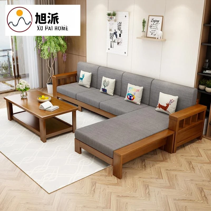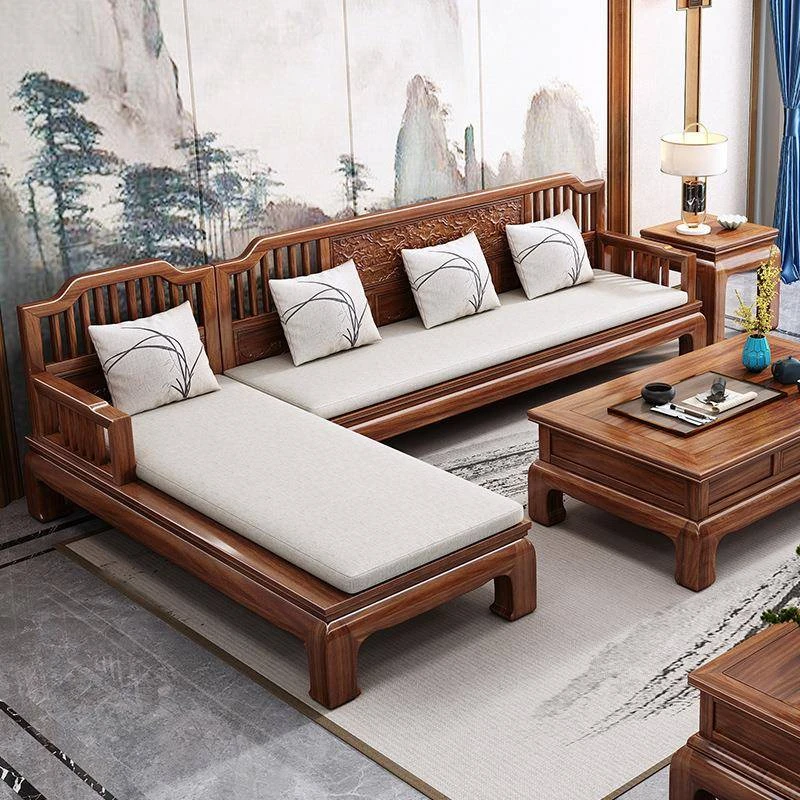 モダンミニマリスト新中式デザインの天然木製コーナーカウチソファセット - 小型リビングに最適、冬夏兼用の快適な家具で、スタイリッシュな空間を演出します!
