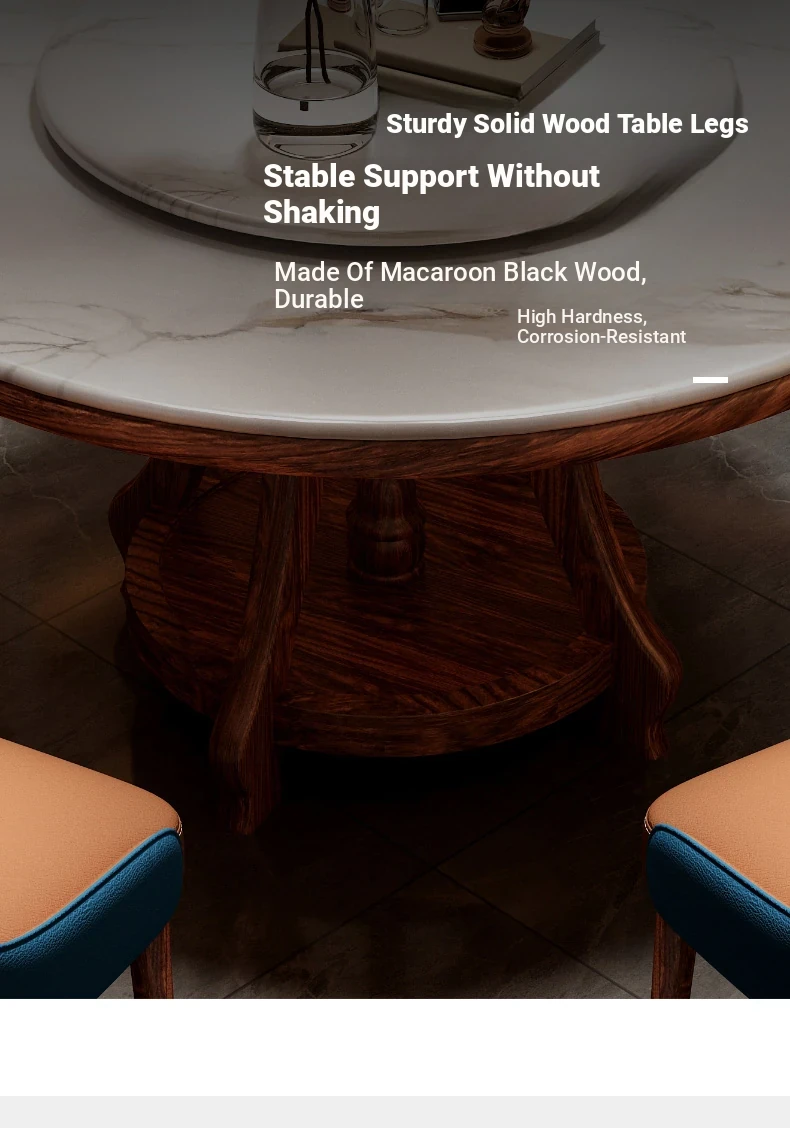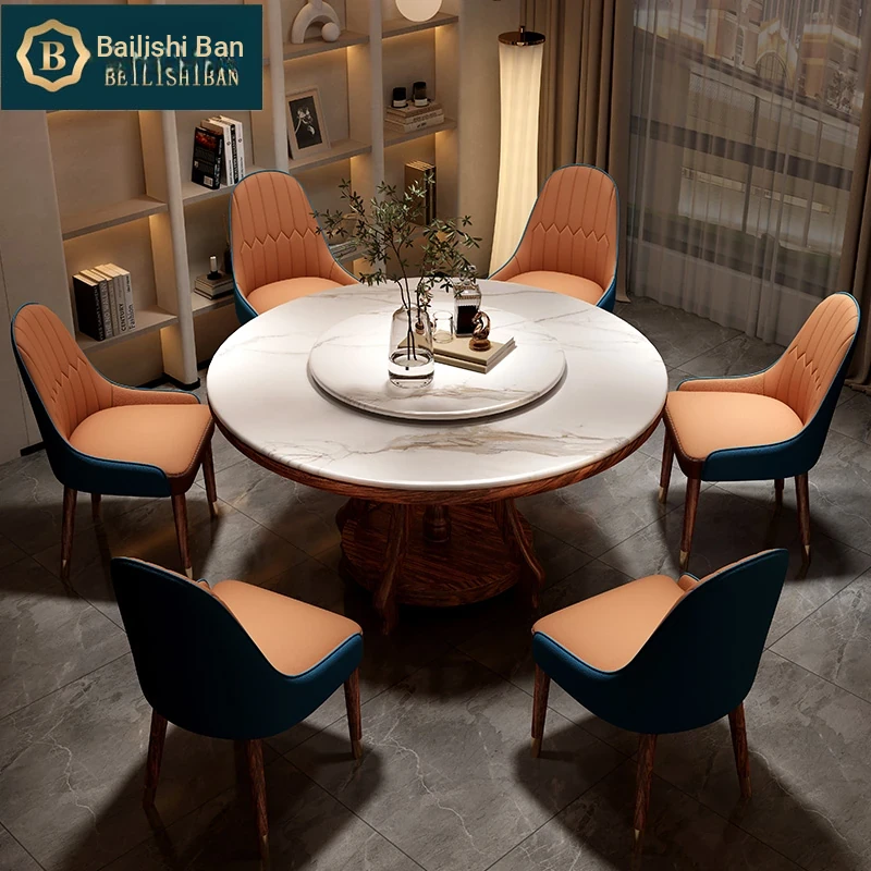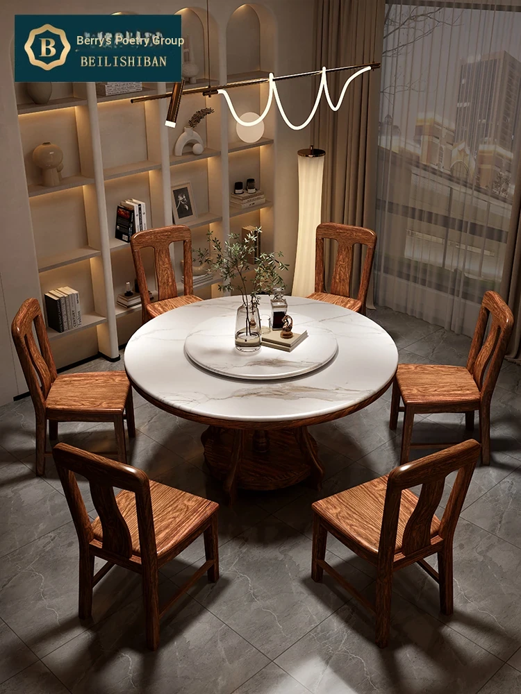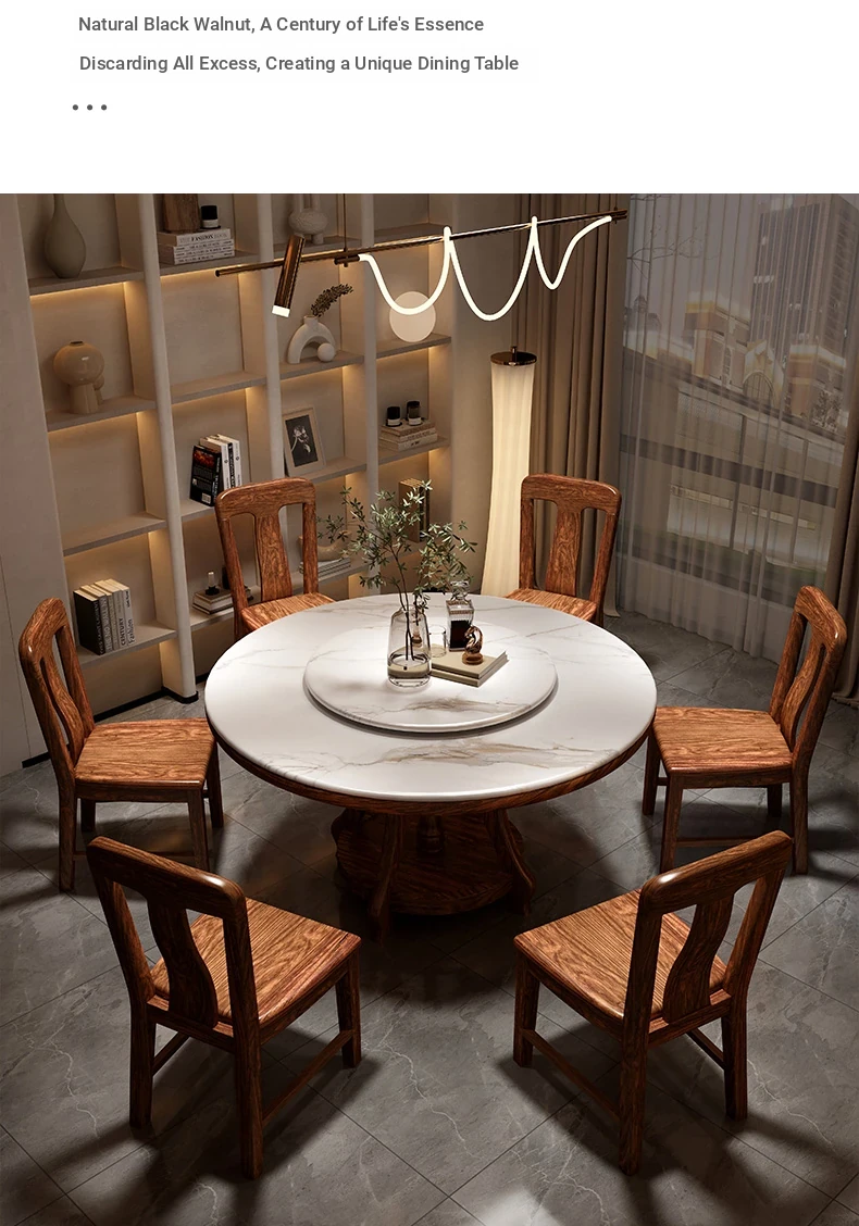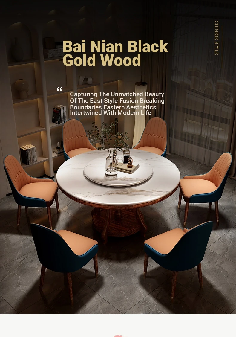 Elegant Black Golden Wood Marble Round Dining Table - Modern Minimalist New Chinese Style Solid Wood Set with Dining Chairs for Luxurious Dining Experience
