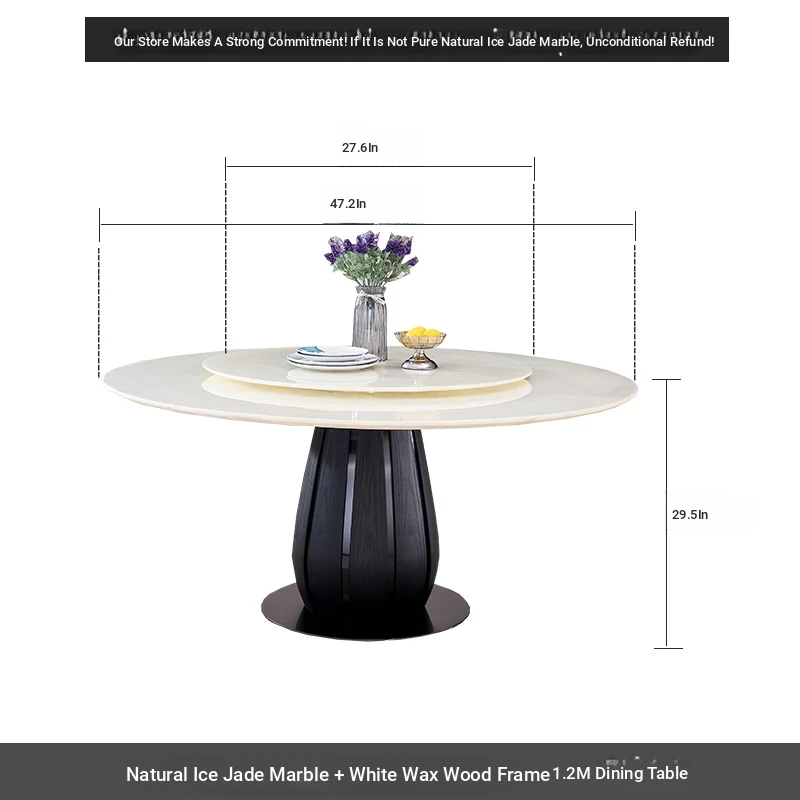 47.24 in + 27.56 in turntable + dining chair*6 (natural ice marble + white wax wood frame + black titanium base)