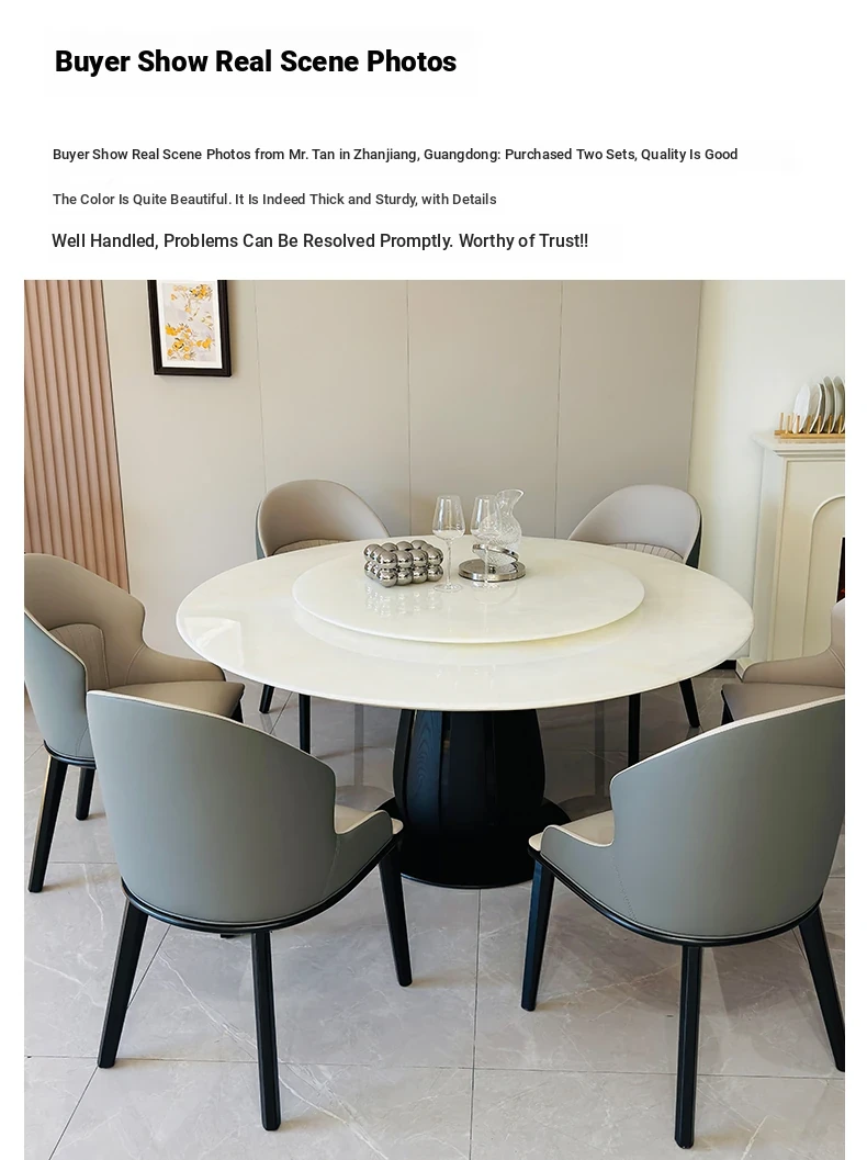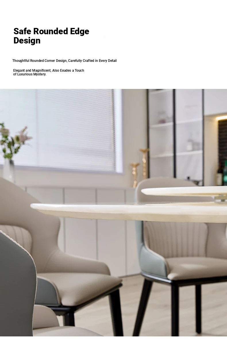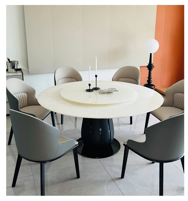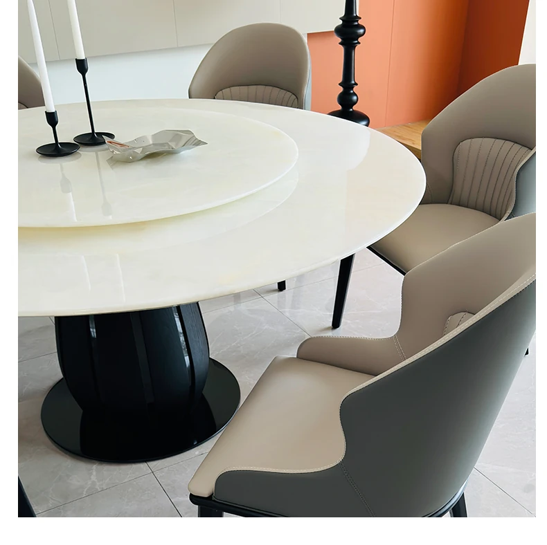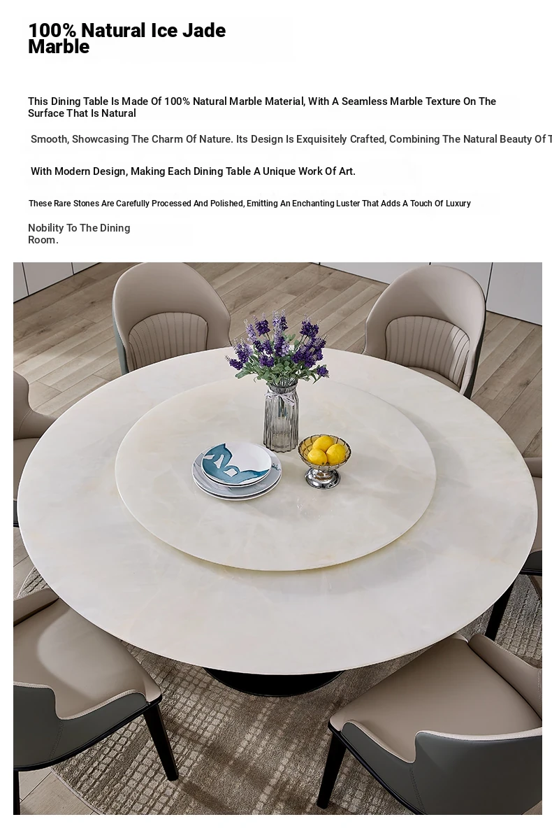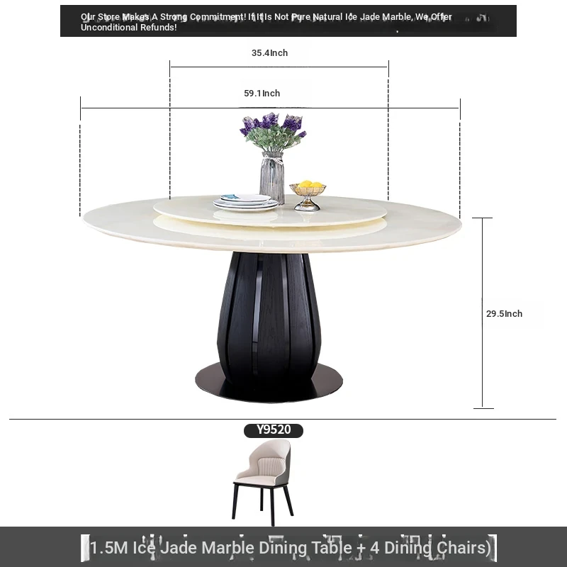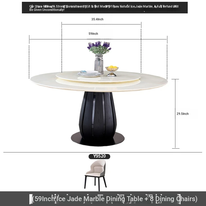 59.06 in + 35.43 in turntable + dining chair*10 (natural ice marble + white wax wood frame + black titanium base)