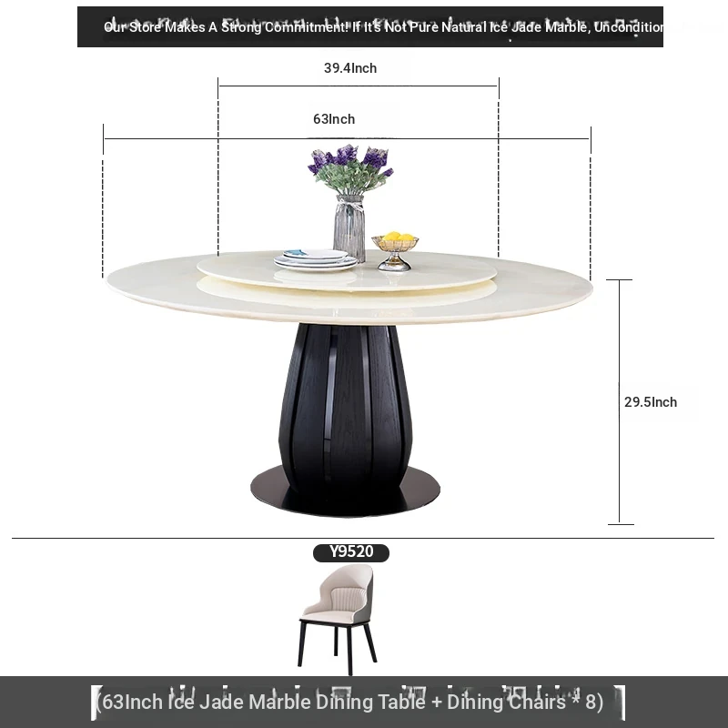 62.99 in+39.37 in turntable + dining chair*8 (natural ice marble + white wax wood frame + black titanium base)