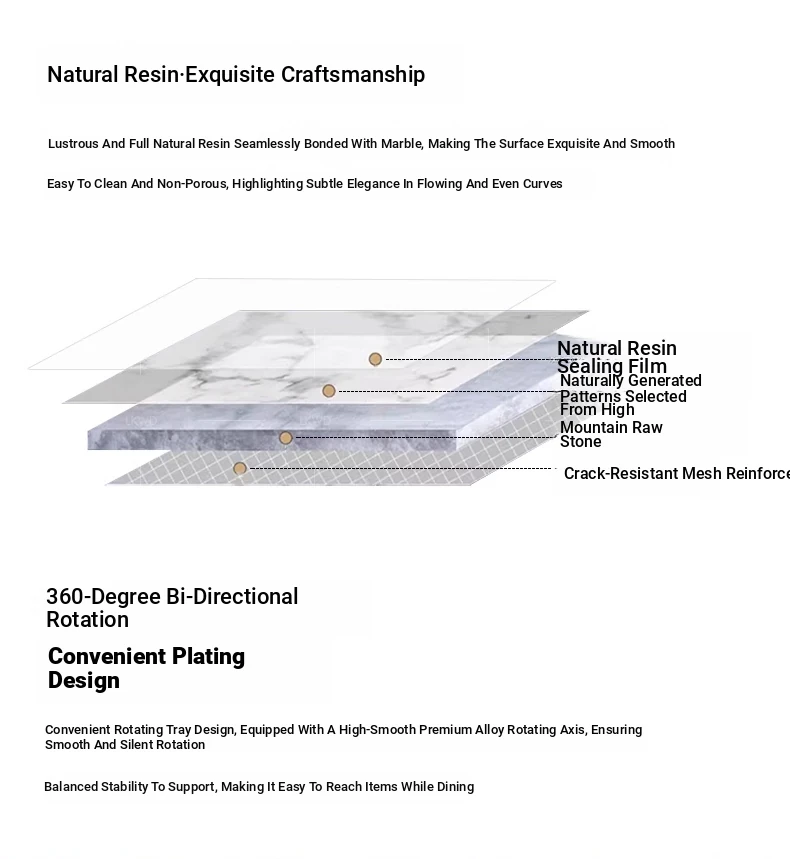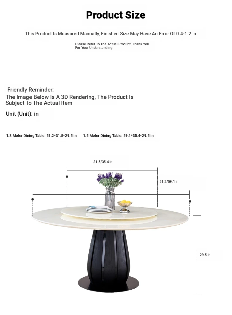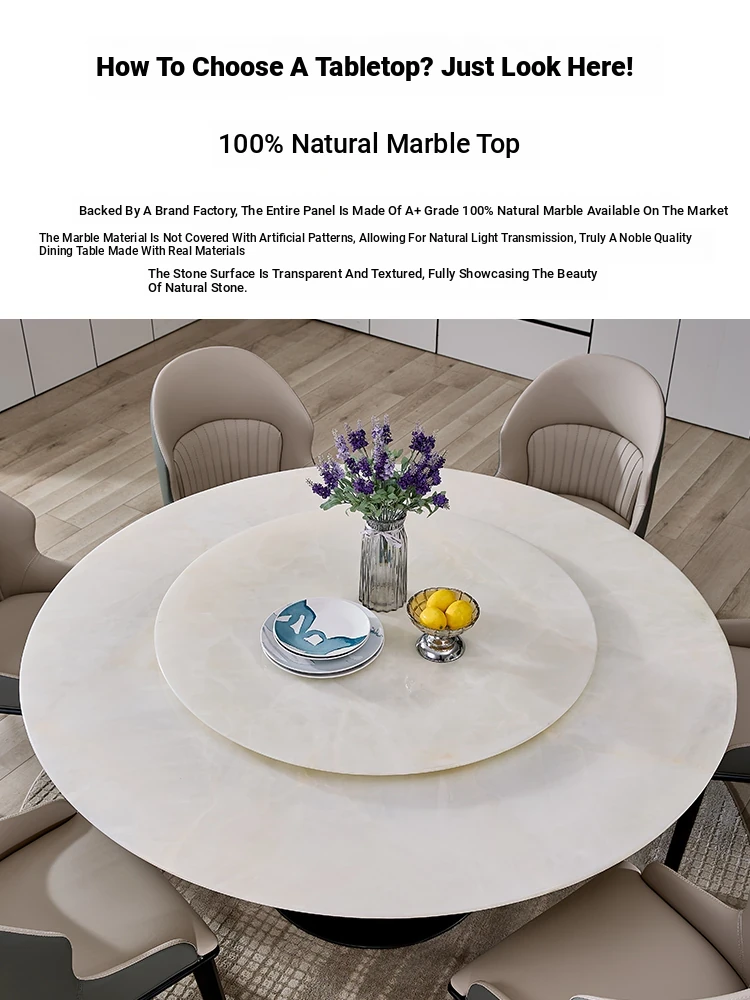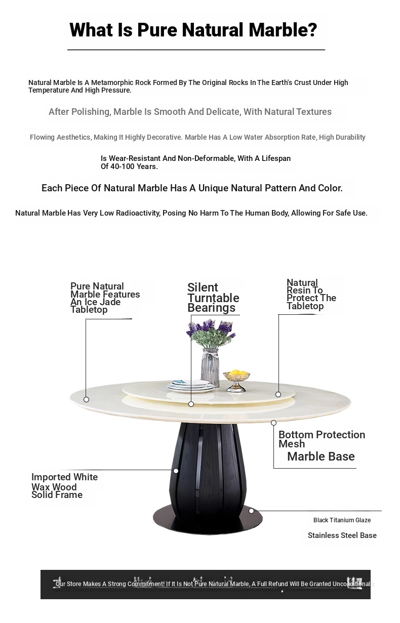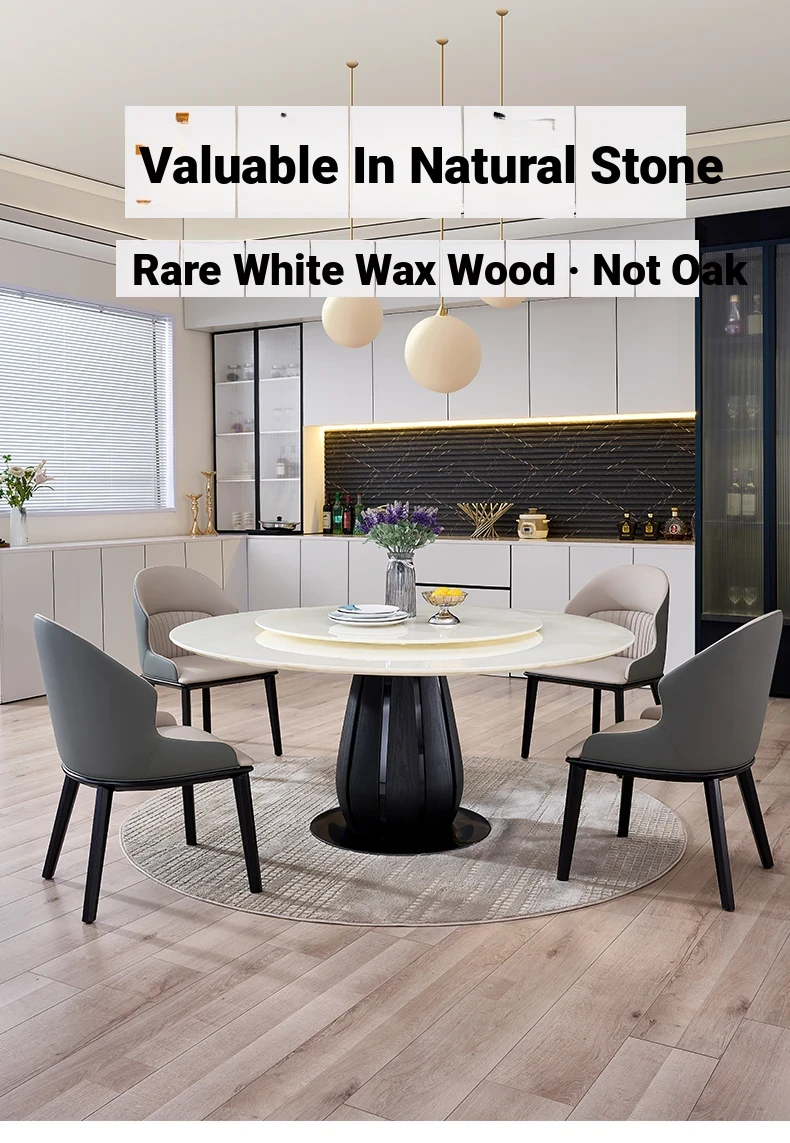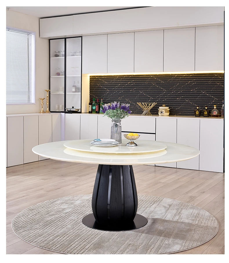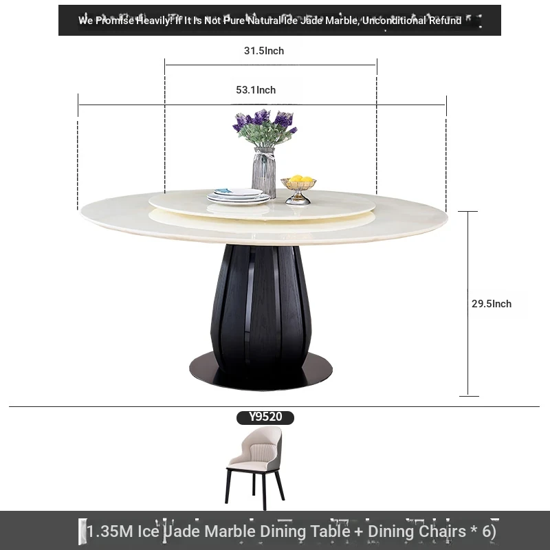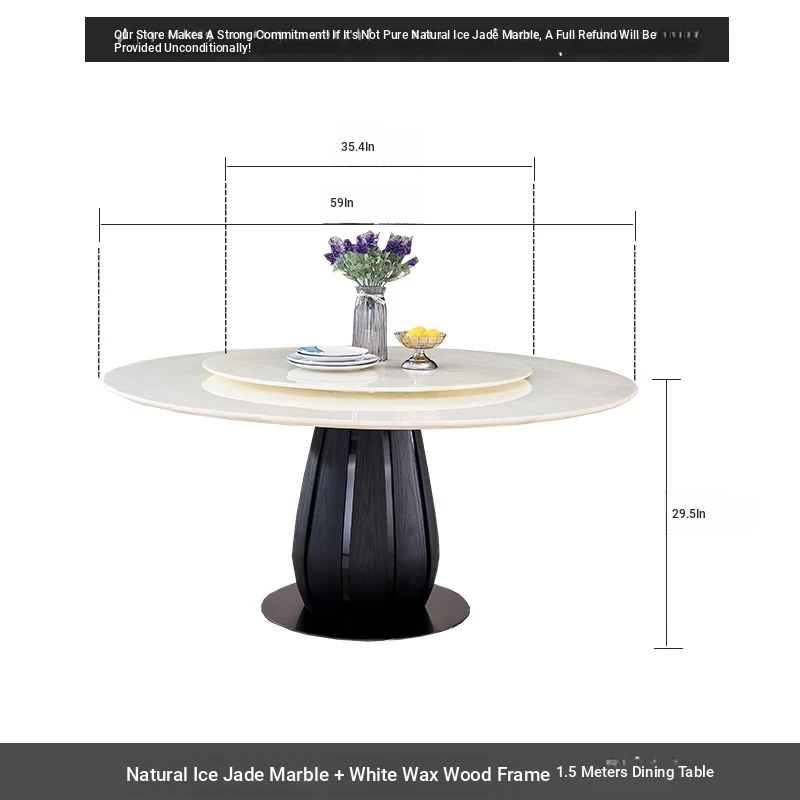 51.18 in + 29.53 in turntable + dining chair*6 (natural ice marble + white wax wood frame + black titanium base)