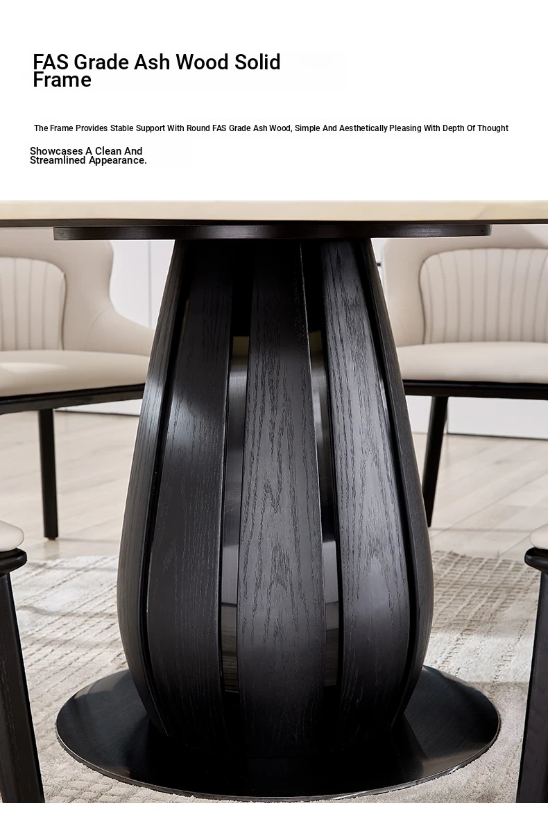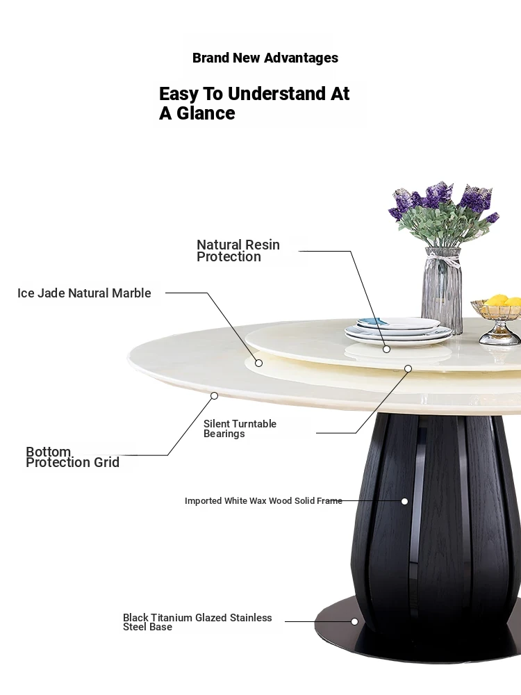 43.31 in + 23.62 in turntable + dining chair*6 (natural ice marble + white wax wood frame + black titanium base)