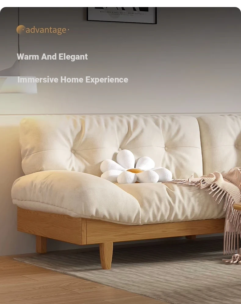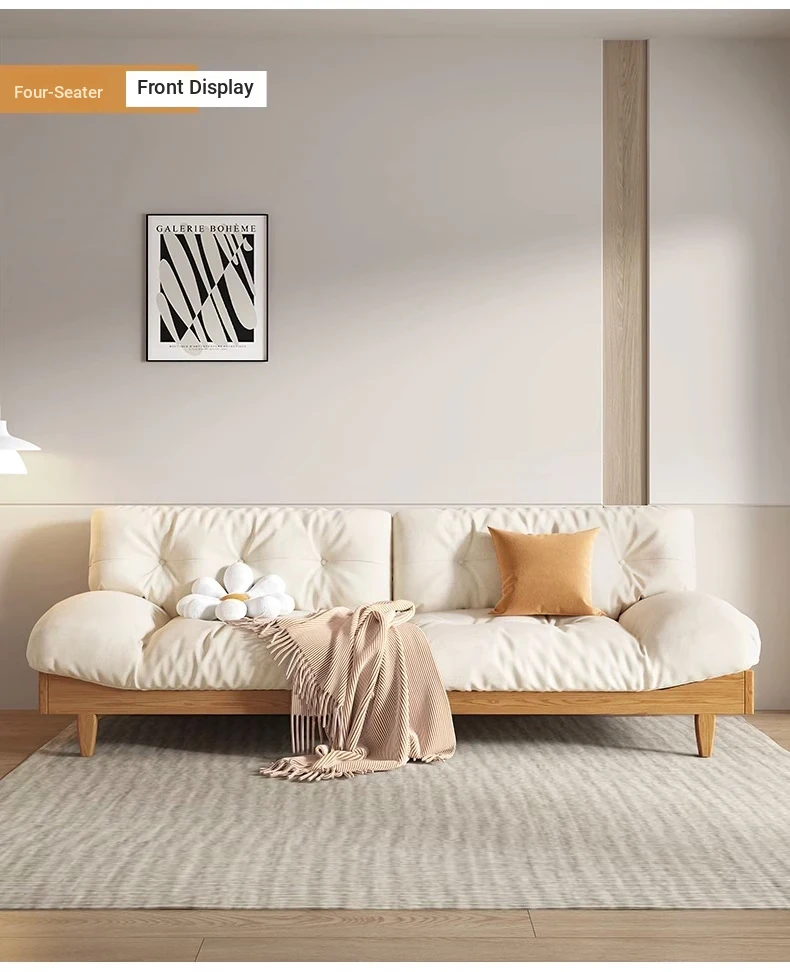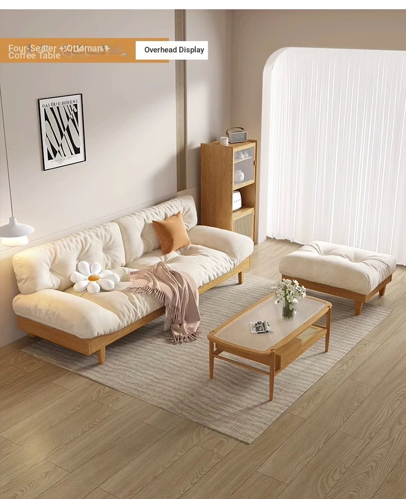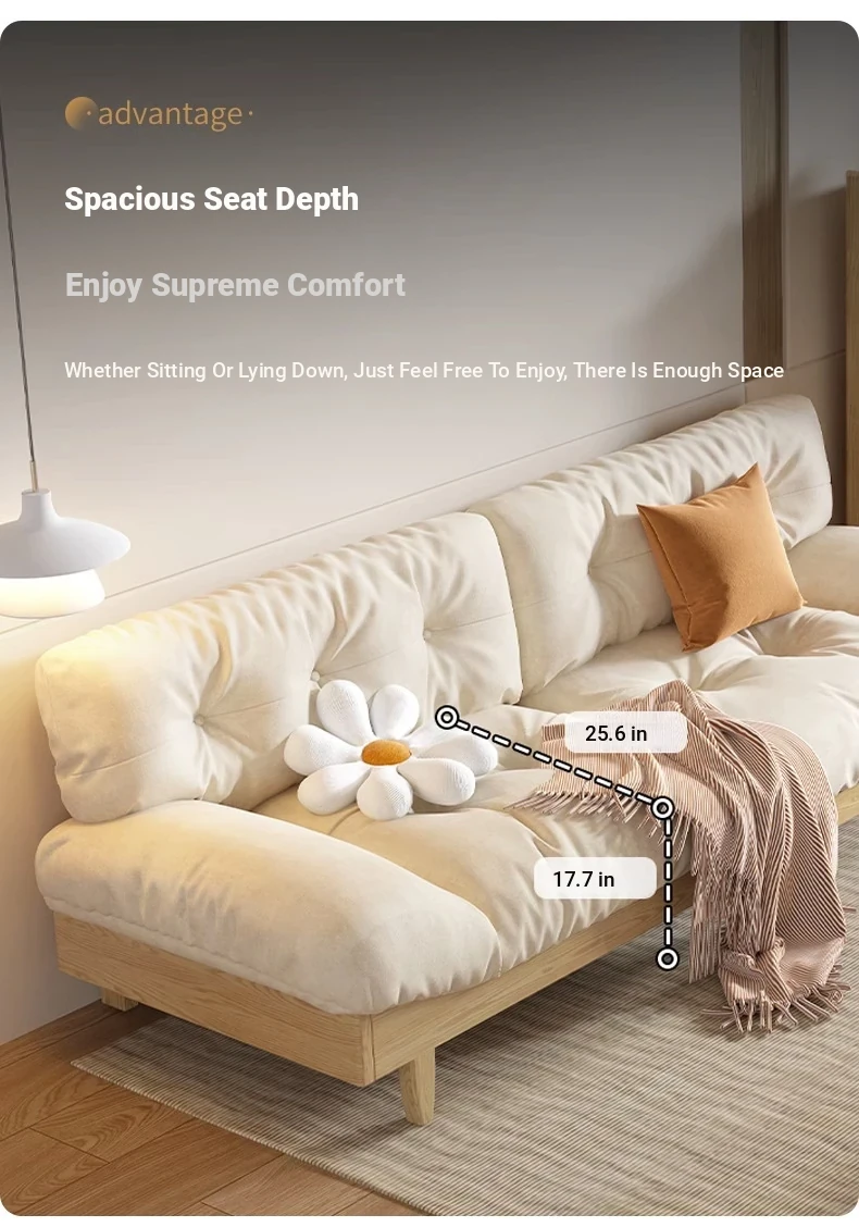 Japanese Wabi-Sabi Style White Wax Wood Cloud Sofa - Creamy White Solid Wood with Soft Velvet Fabric, Perfect for Stylish and Cozy Living Spaces
