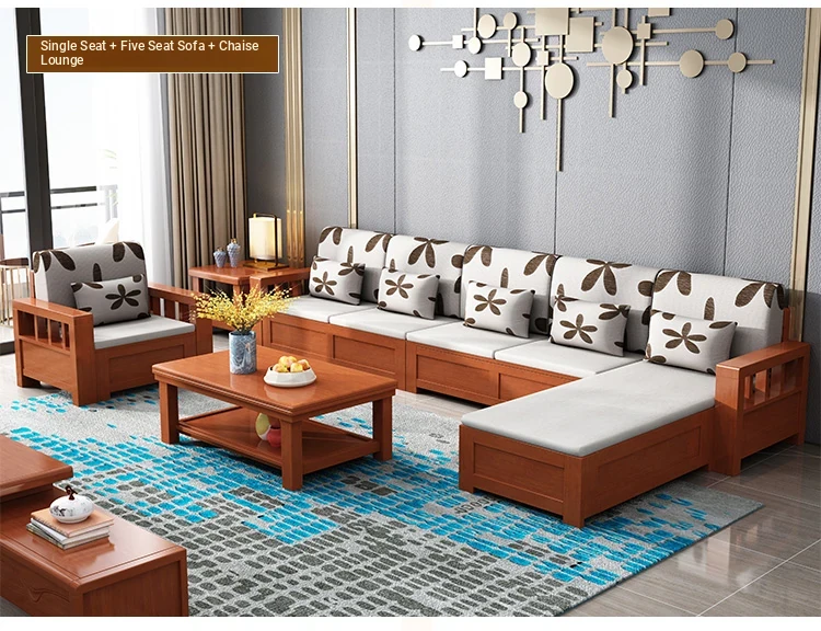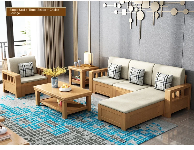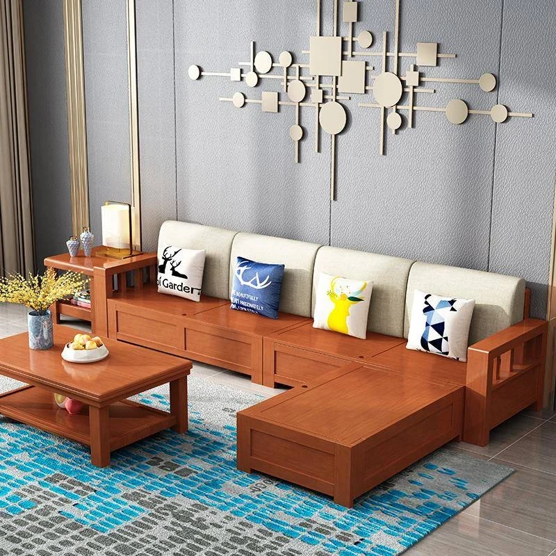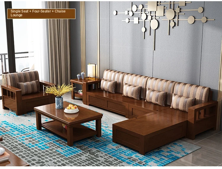 L-Shaped Solid Wood Sofa Set with Storage - Versatile Winter & Summer Use, New Chinese Style Fabric Corner Chaise for Living Room