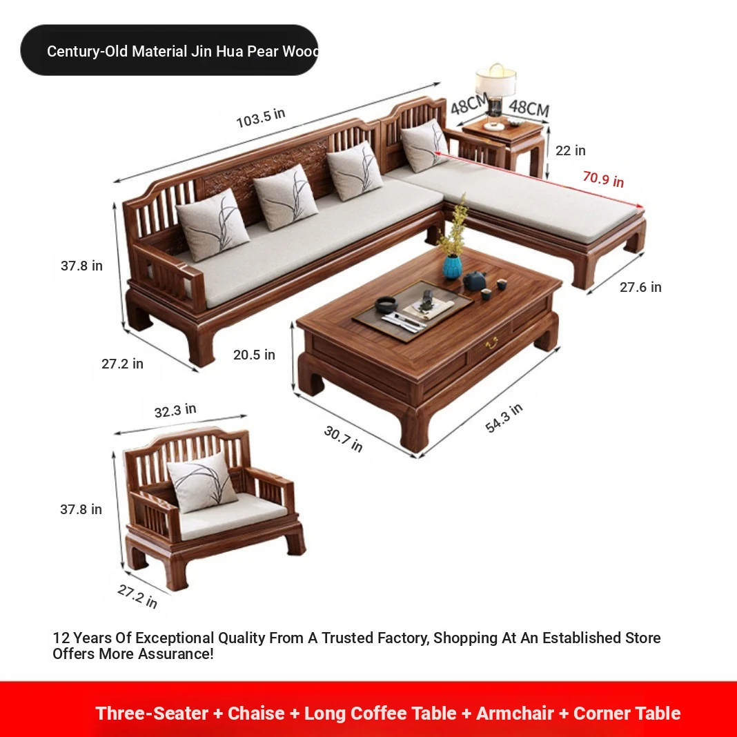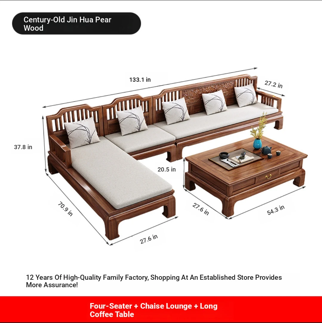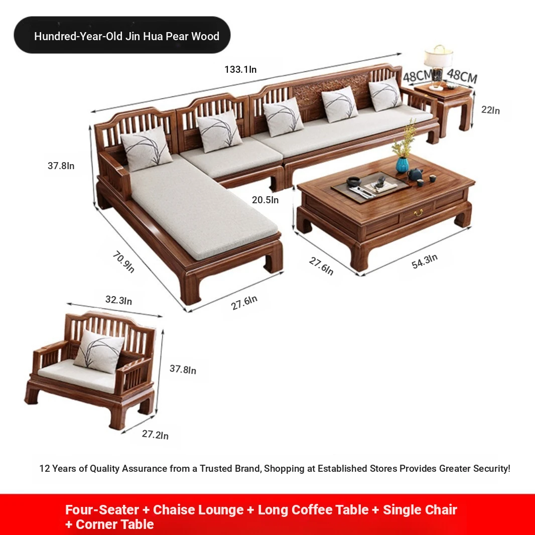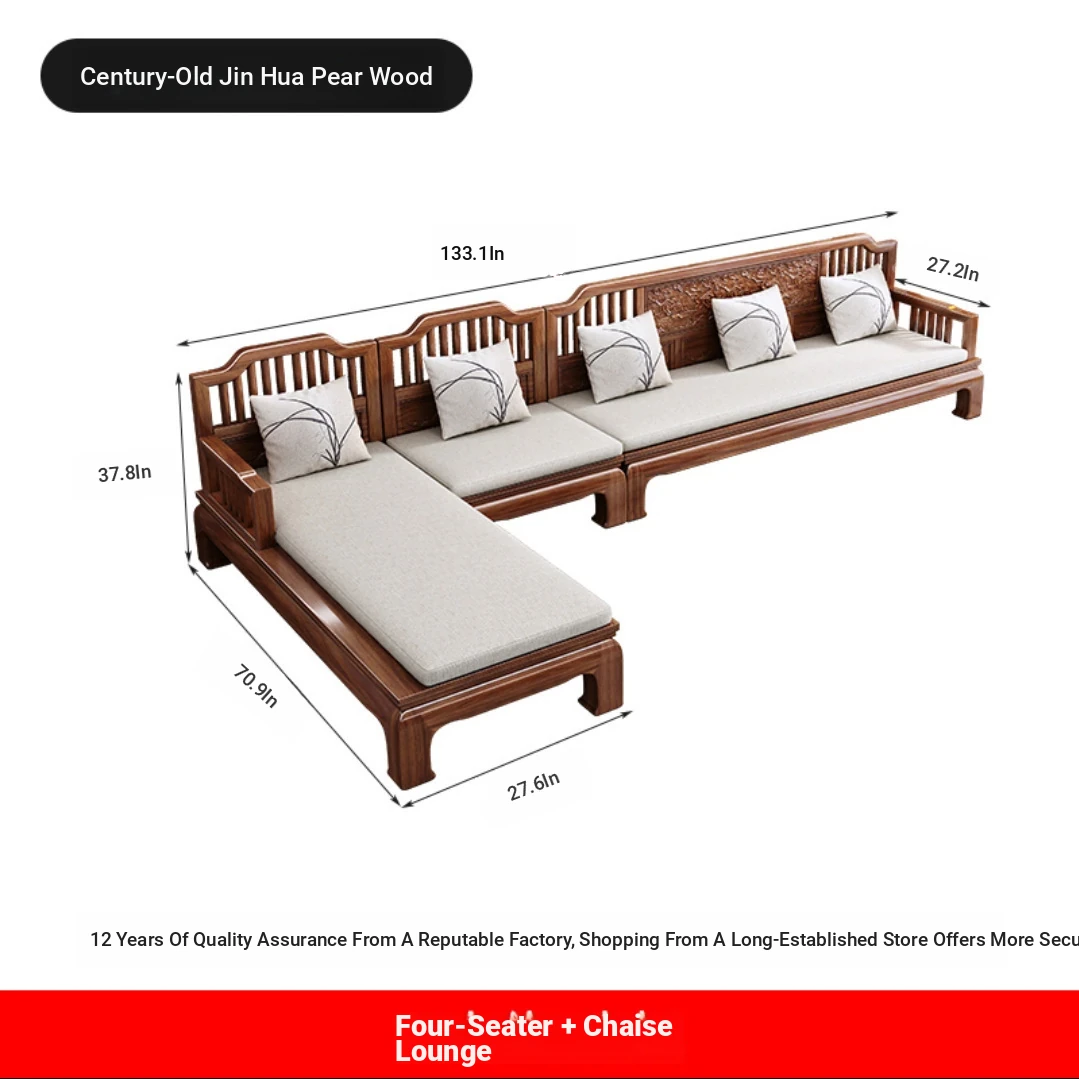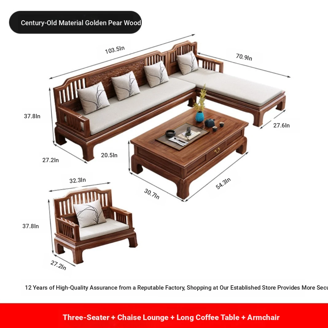 Modern Chinese Antique Style Golden Pear Wood Sofa Set - Versatile Corner Chaise Lounge for All Seasons, Fully Solid Wood Construction, Elegant and Minimalist Design.