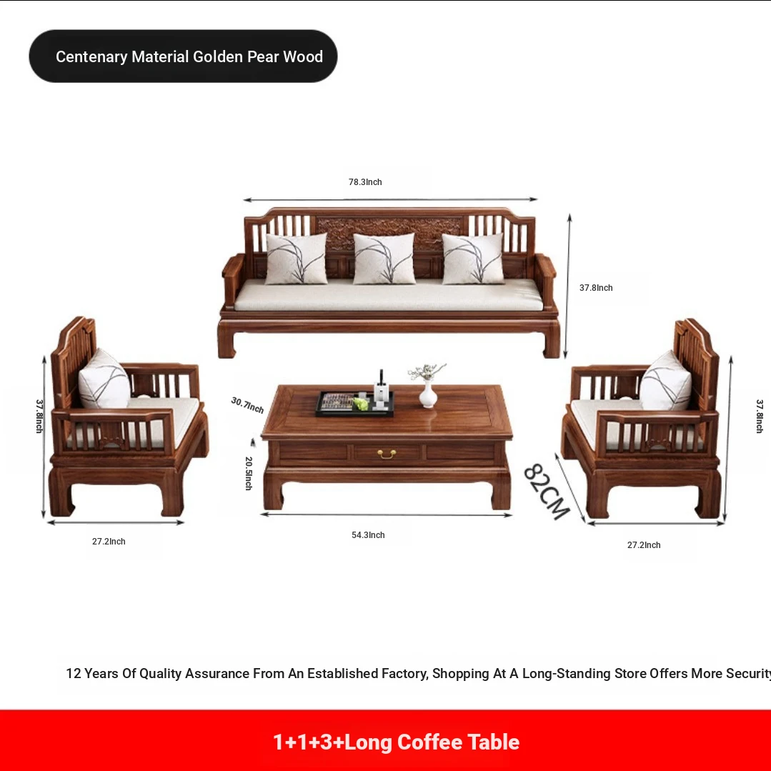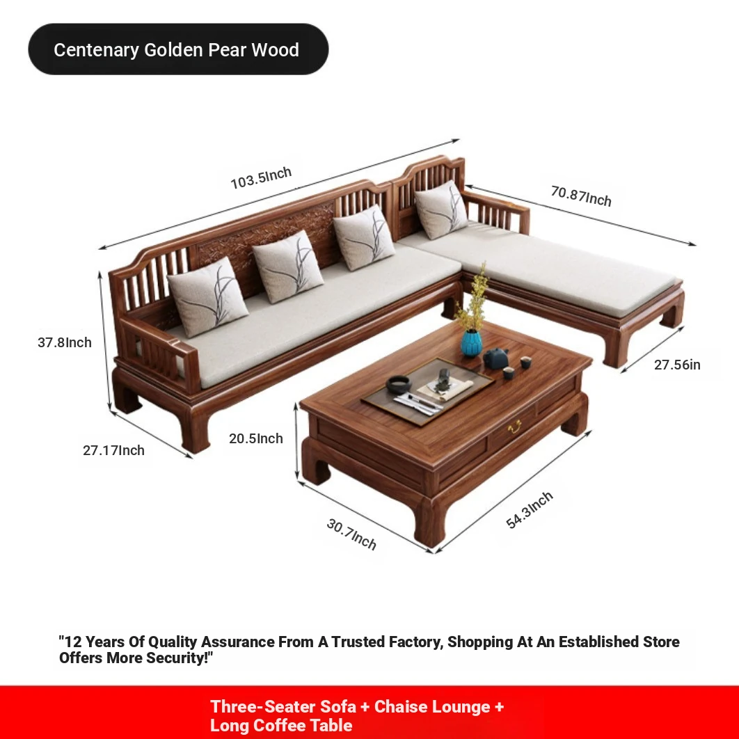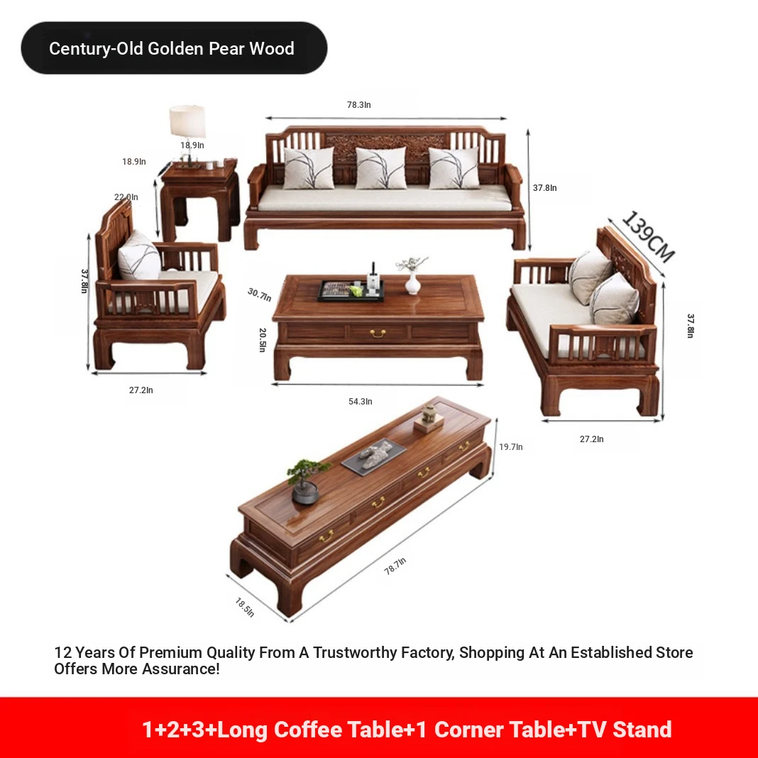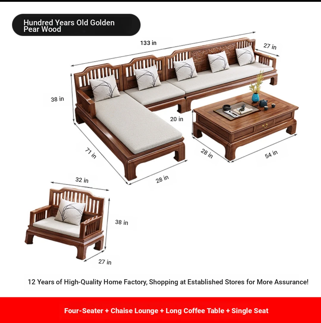 Modern Chinese Antique Style Golden Pear Wood Sofa Set - Versatile Corner Chaise Lounge for All Seasons, Fully Solid Wood Construction, Elegant and Minimalist Design.