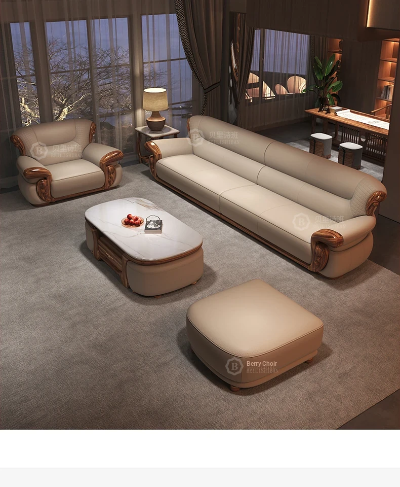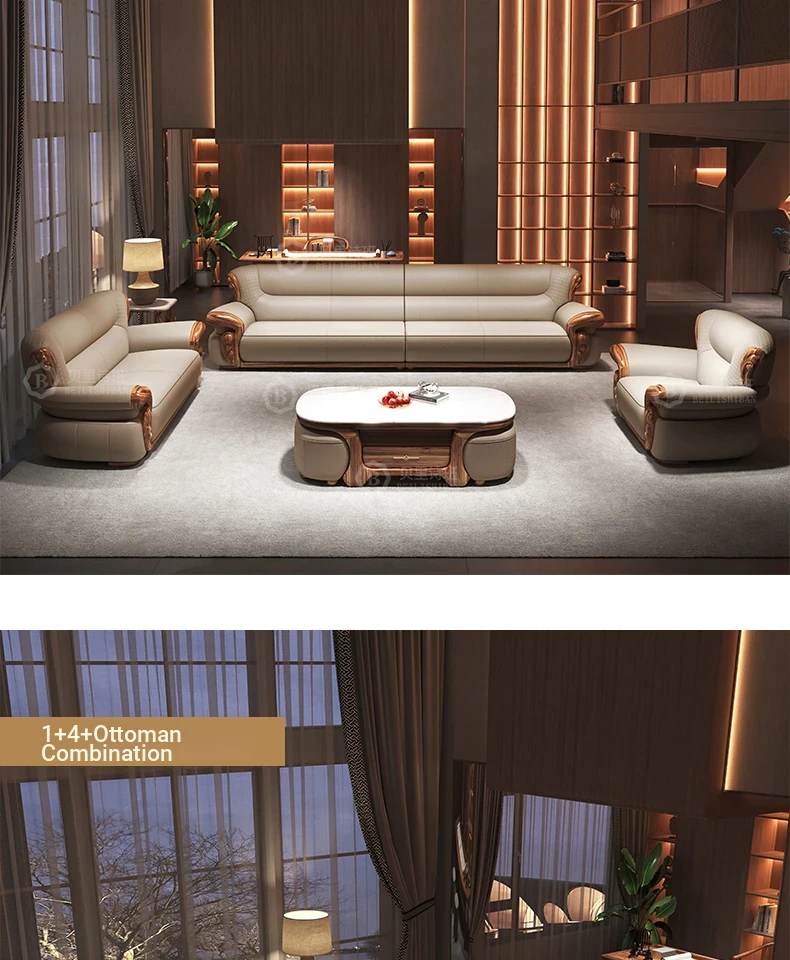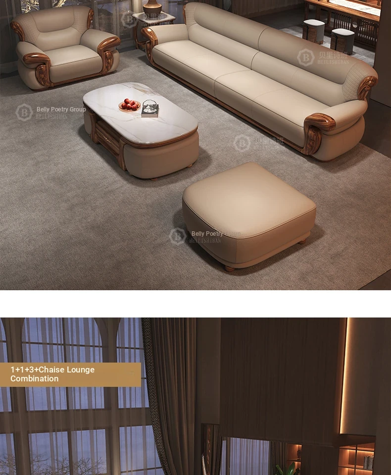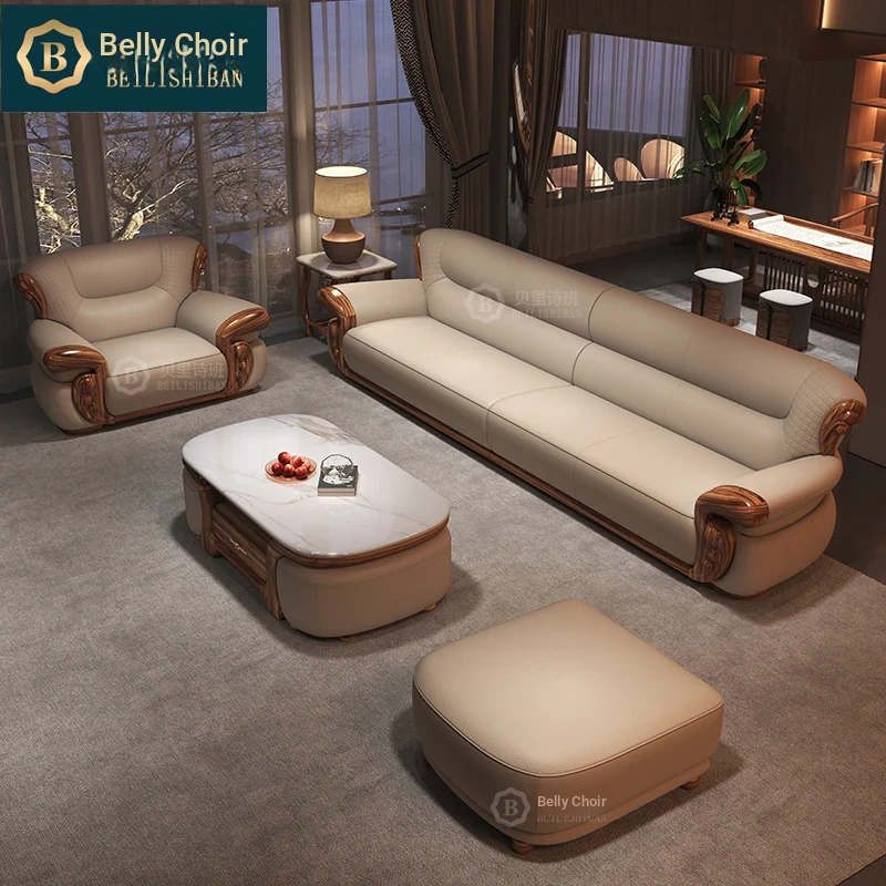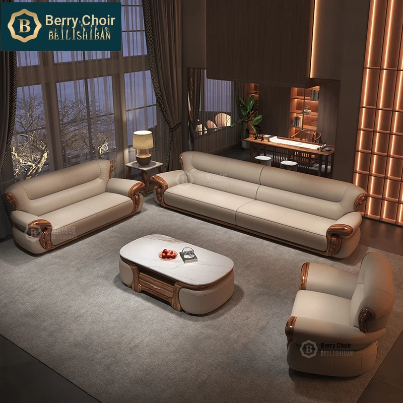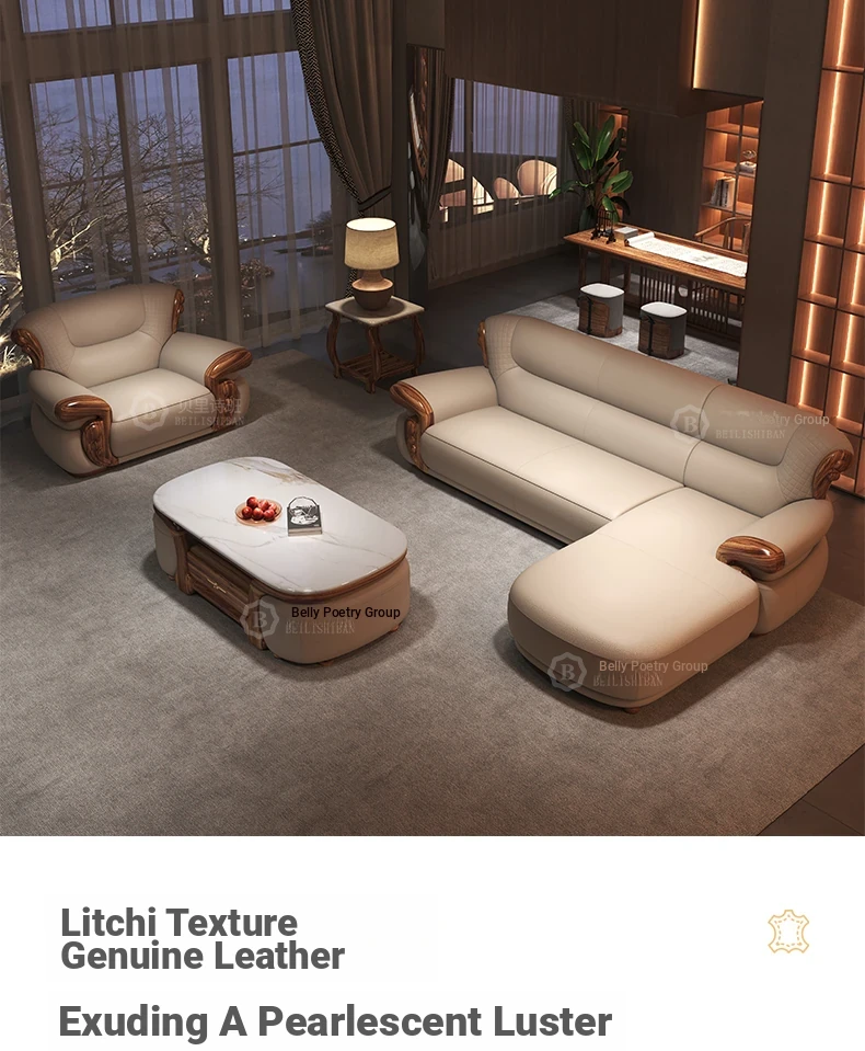 Modern Minimalist New Chinese Style Black Gold Wood Genuine Leather Sofa Set – 2025 New Arrival for Living Room, Straight and Corner Design with Solid Wood Frame
