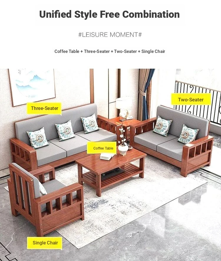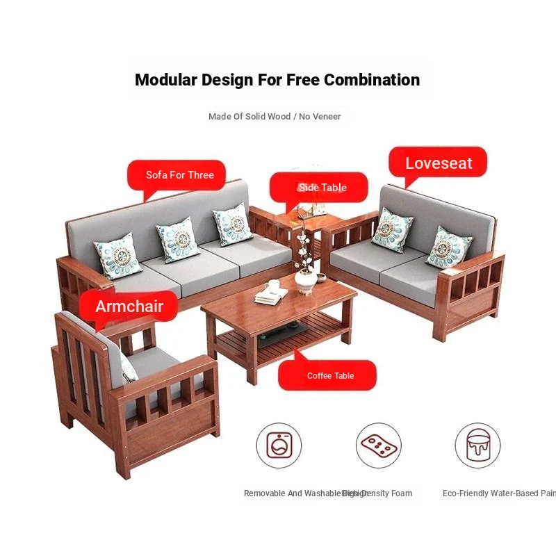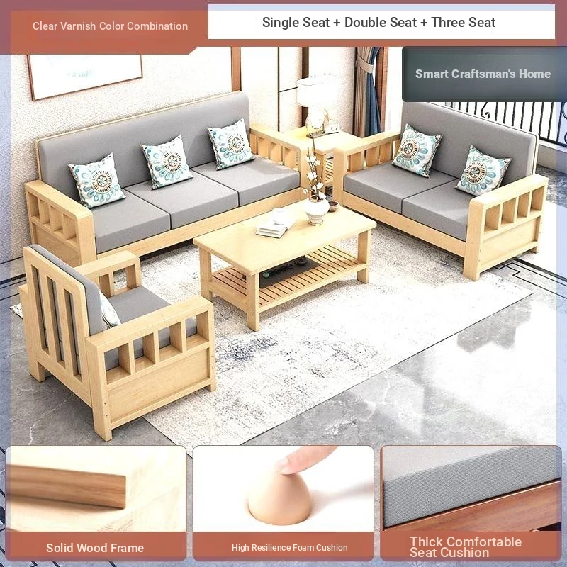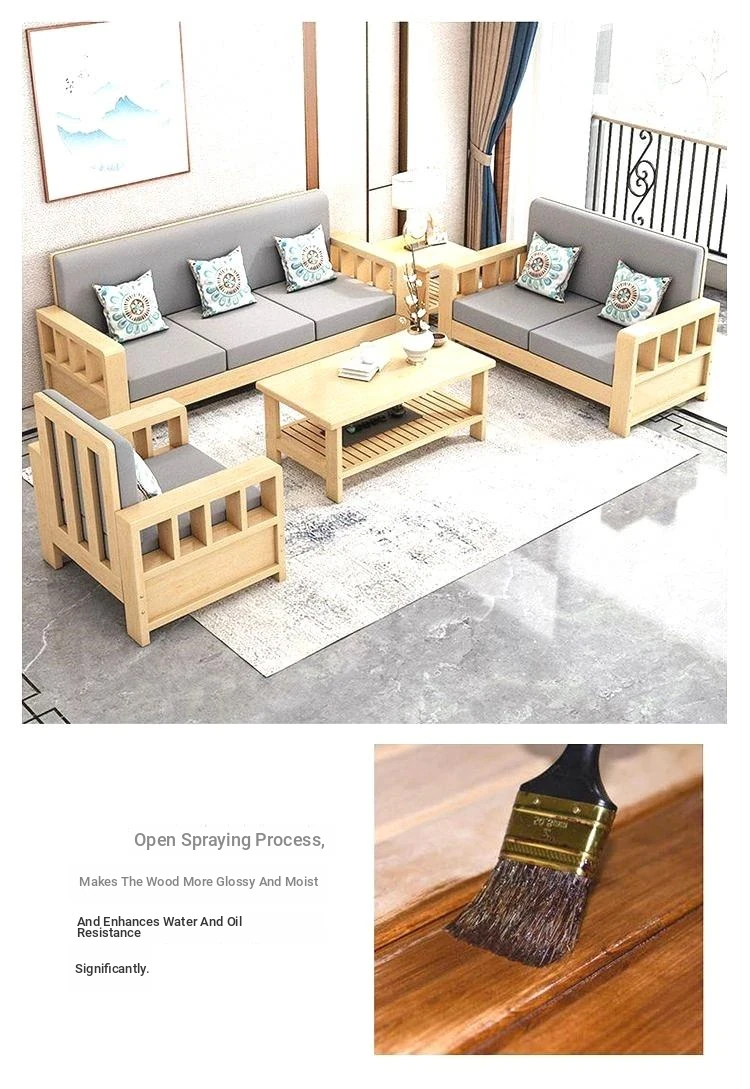 [Combination] 1+2+3-person sofa + tea table + square table/transparent varnish color [real wood cushion pillow]]