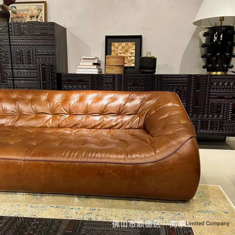 Vintage Retro Genuine Leather Waxed Sofa - No Armrest, Straight Design, Perfect for Living Rooms and Villas - Stylish Bean Bag with Button Details - Quality Guaranteed!