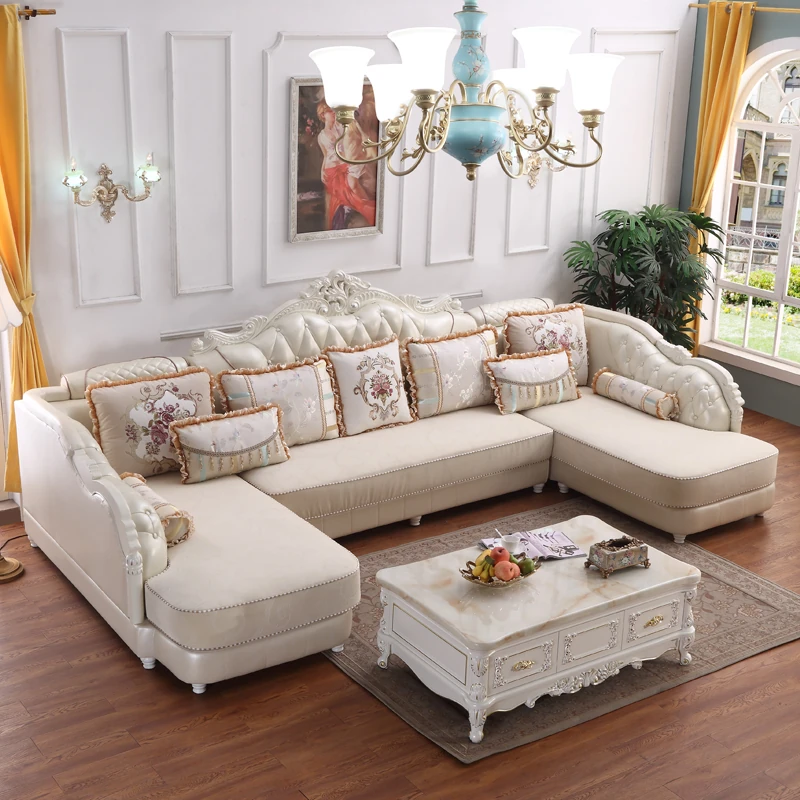 Elegant European-Style U-Shaped Sofa Set for Living Room - 4m Luxurious Double Chaise Lounge, Minimalist Design, Solid Wood, Ideal for Spacious Villas and High-End Homes.