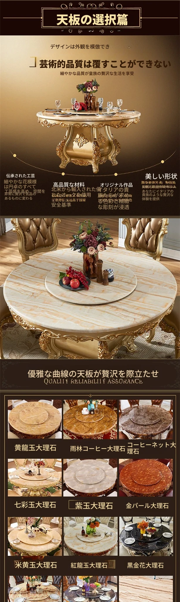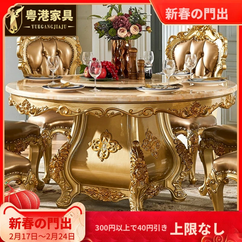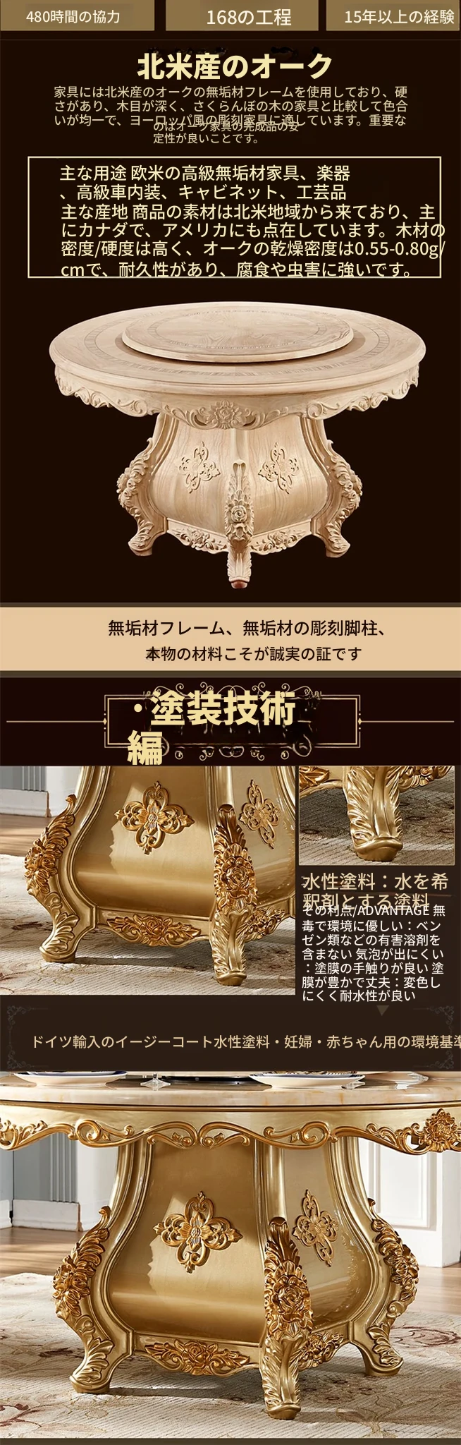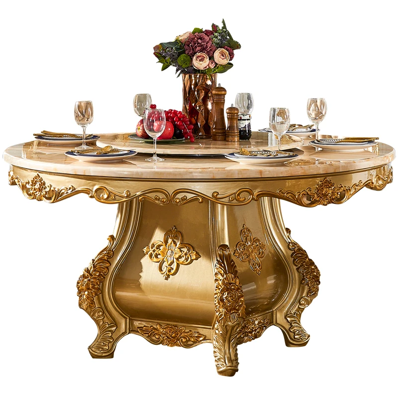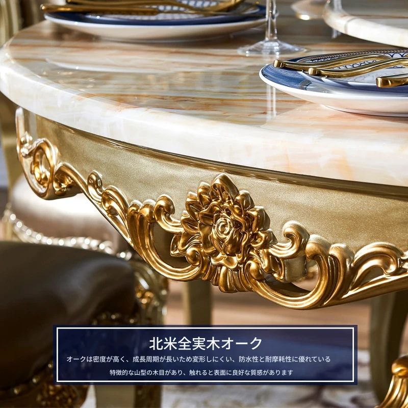 エレガントなヨーロピアンスタイルの大理石ラウンドテーブル - アメリカンスタイルの回転台付き、全実木の彫刻仕上げ、家庭用ダイニングテーブルセット、シャンパンゴールドカラーで華やかさを演出!