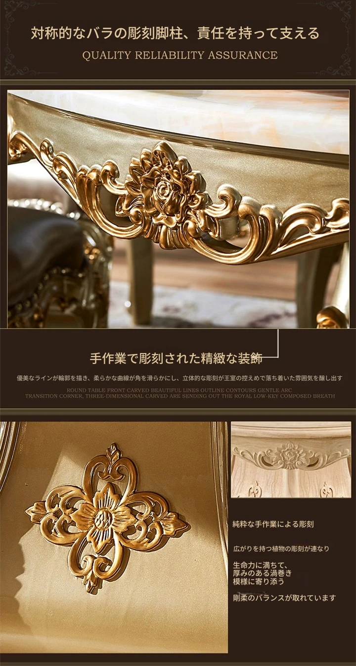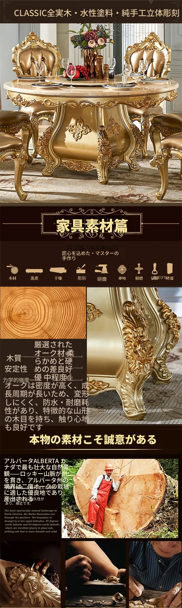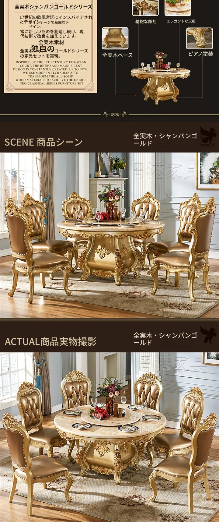 エレガントなヨーロピアンスタイルの大理石ラウンドテーブル - アメリカンスタイルの回転台付き、全実木の彫刻仕上げ、家庭用ダイニングテーブルセット、シャンパンゴールドカラーで華やかさを演出!
