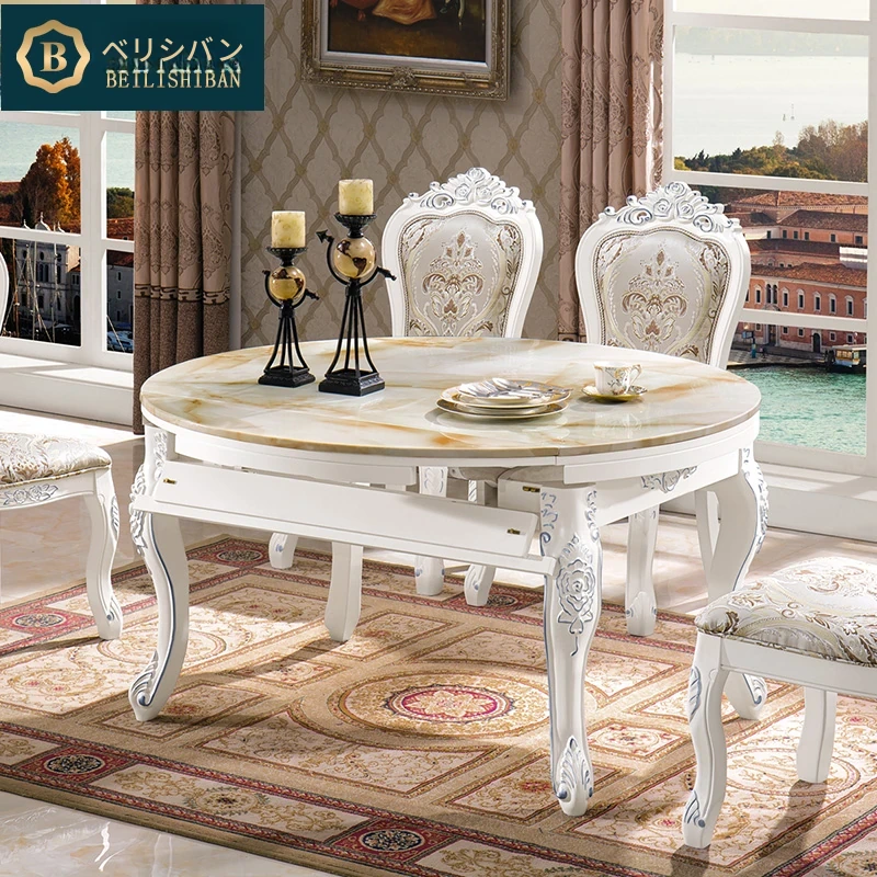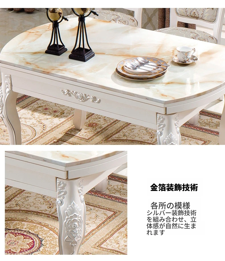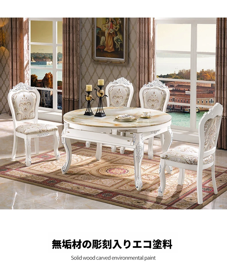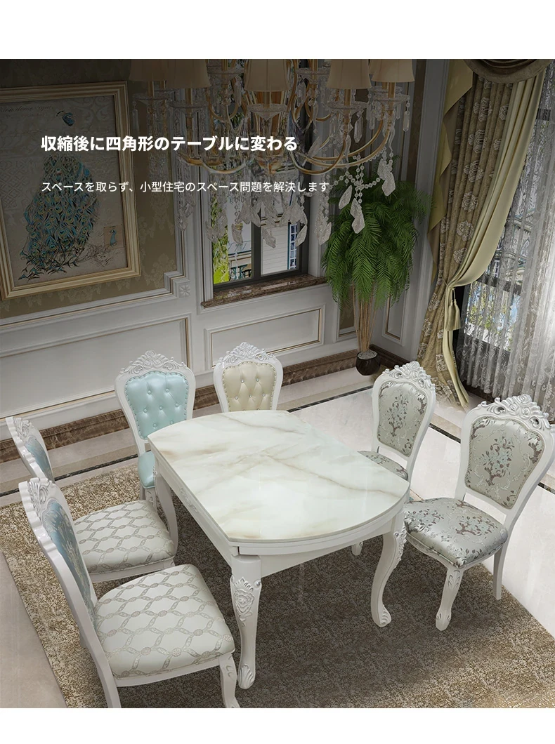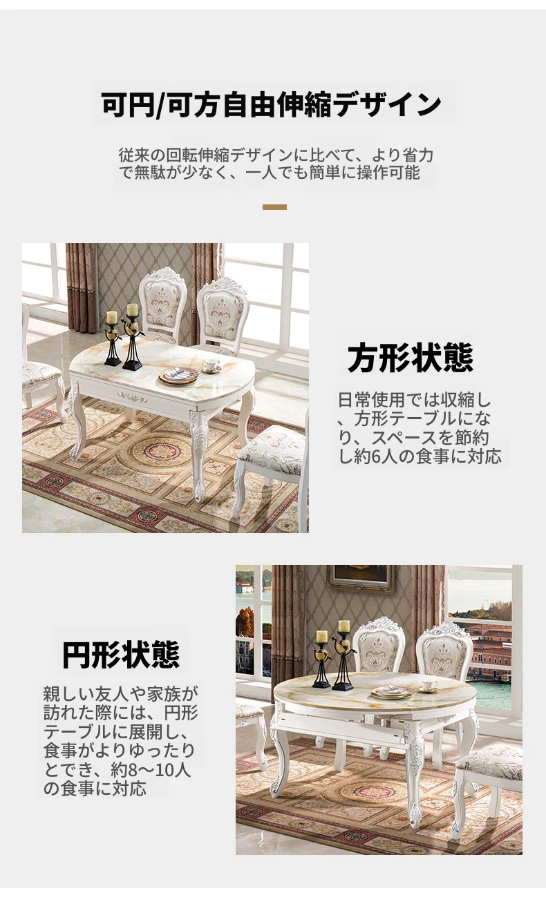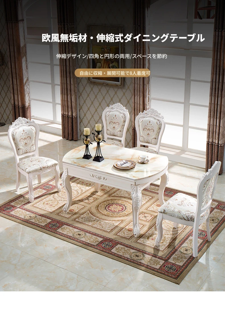 優雅なデザインの丸型から四角に変形する伸縮式ダイニングテーブルセット!実木彫刻と大理石の組み合わせで、狭い空間にもぴったりの小型サイズ。シンプルでありながら高級感あふれる欧風スタイルをお楽しみください。