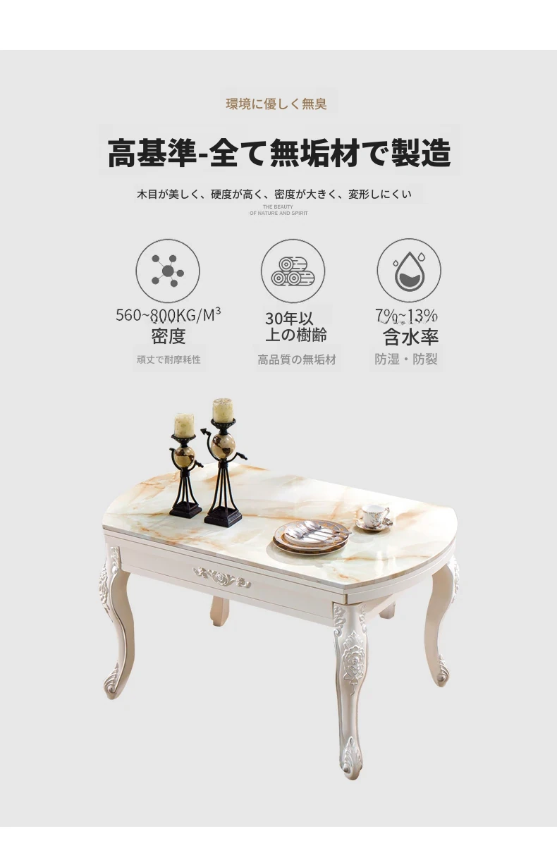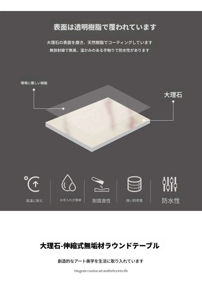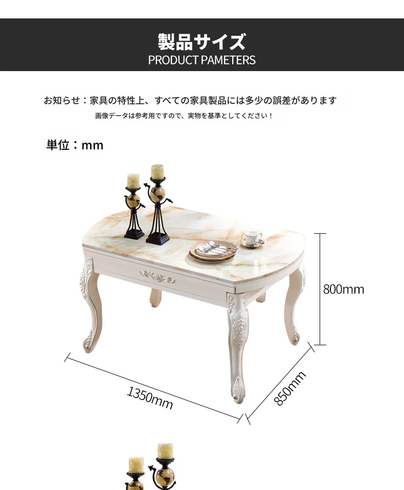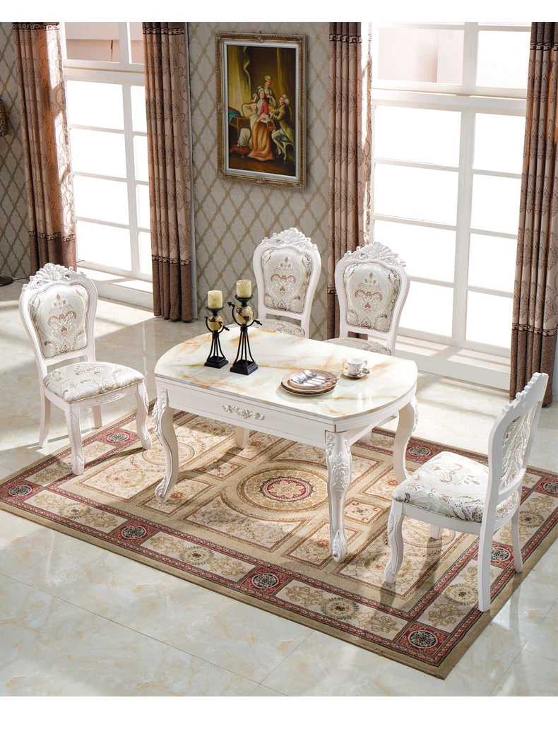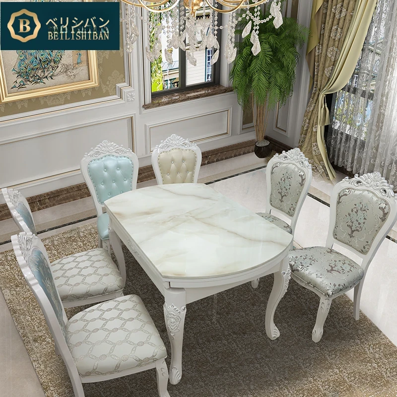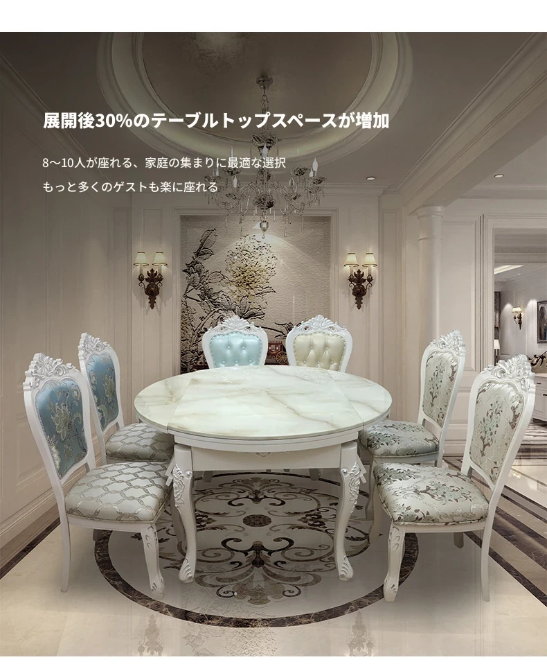 優雅なデザインの丸型から四角に変形する伸縮式ダイニングテーブルセット!実木彫刻と大理石の組み合わせで、狭い空間にもぴったりの小型サイズ。シンプルでありながら高級感あふれる欧風スタイルをお楽しみください。