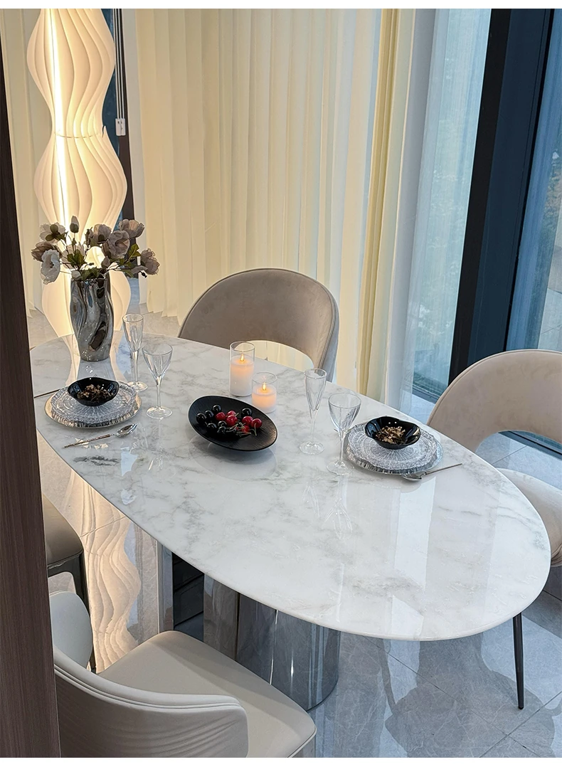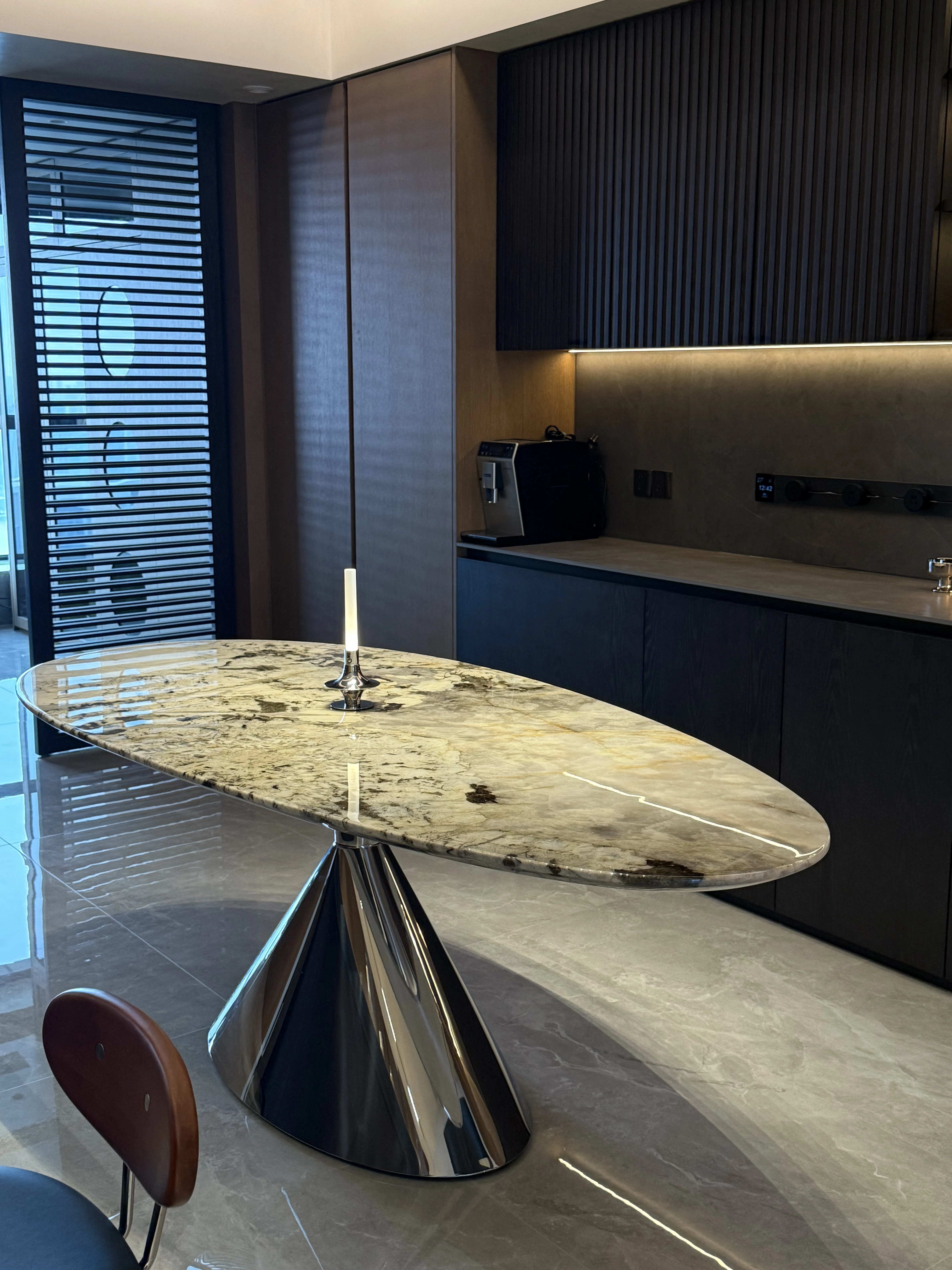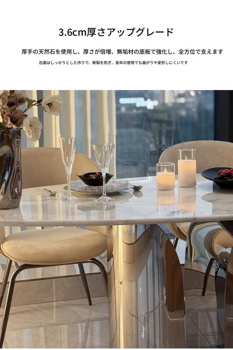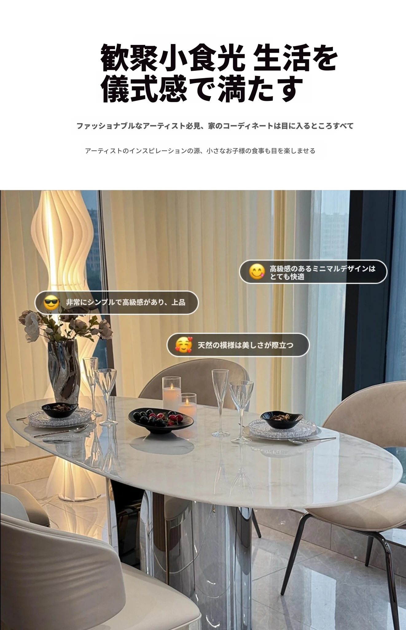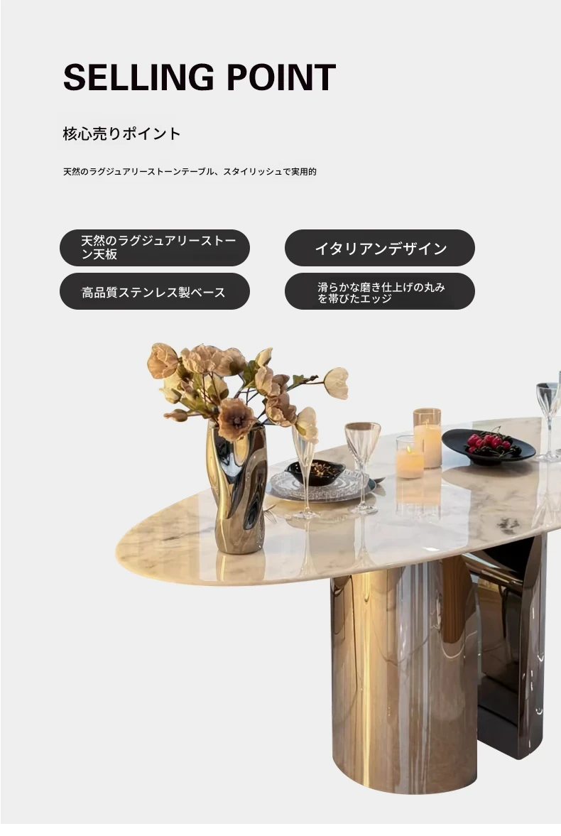 高級感あふれる水滴型大理石ダイニングテーブル - パンドラ天然石使用!おしゃれなイタリアンデザインで、小さなスペースにもぴったりのフライングソーサーテーブル。あなたの食卓を格上げします!