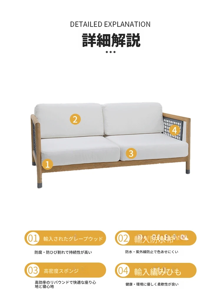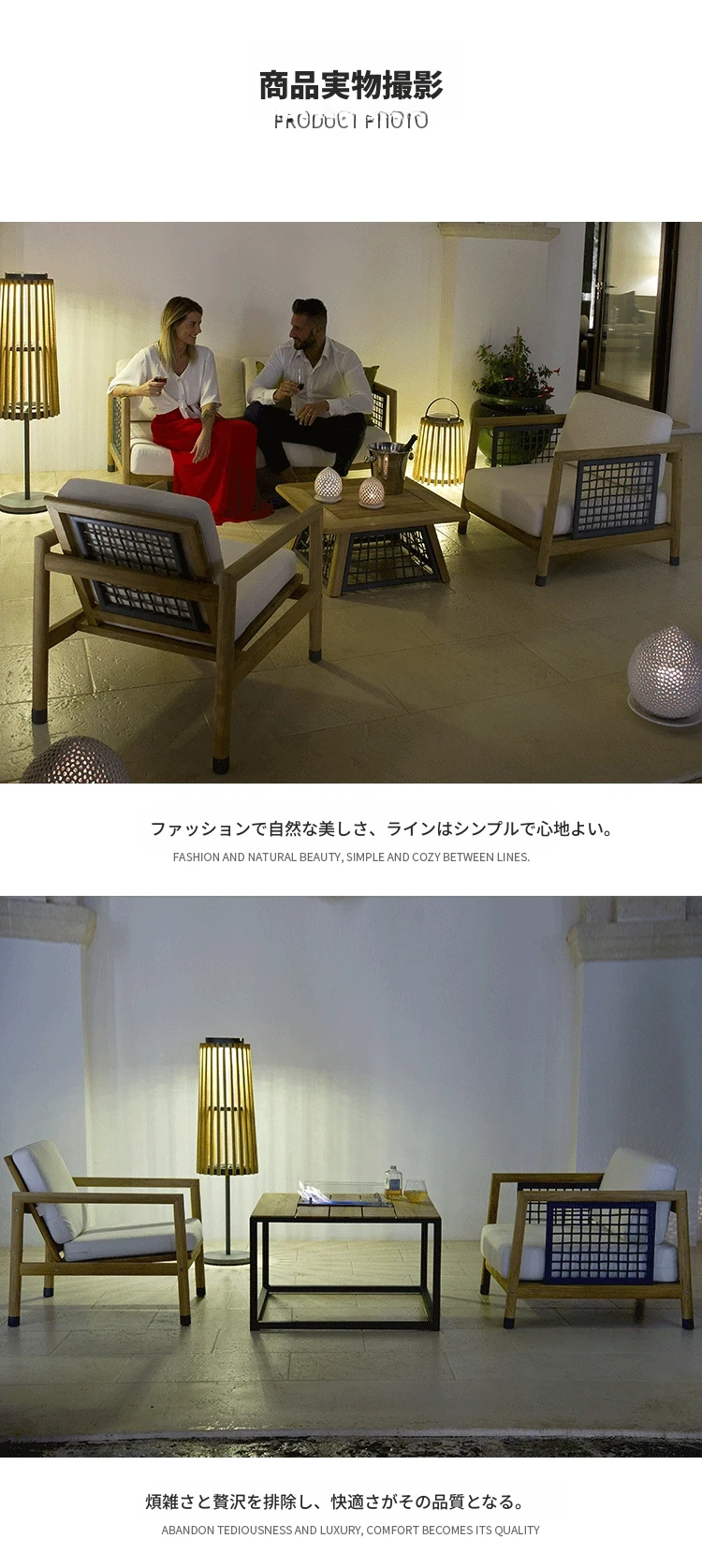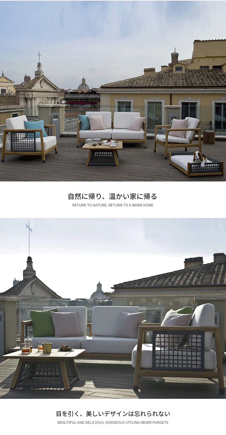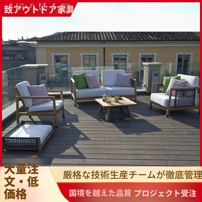 工場直送!欧風アウトドアラタンソファセット - テラスやバルコニーにぴったりなチークウッド家具。ホテルや別荘にも最適な高級感溢れる無垢材ソファコンビネーション。快適なひとときをお届けします!