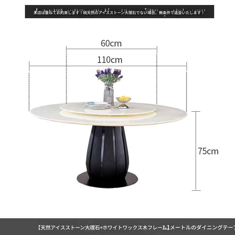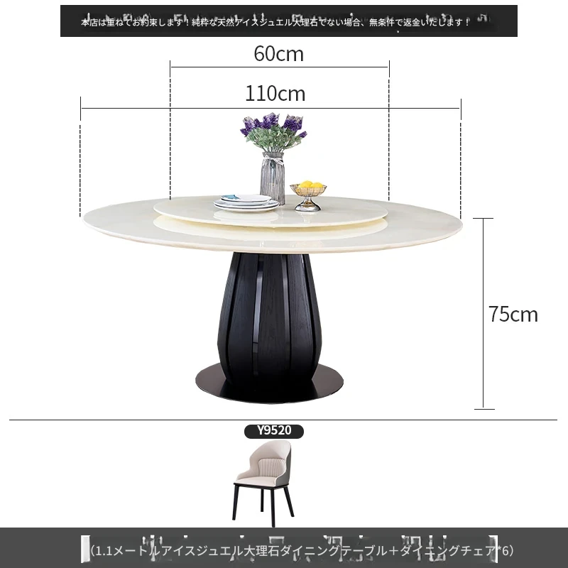 1.1メートル+60cm回転台+ダイニングチェア*6(天然氷玉大理石+ホワイトワックスウッドフレーム+ブラックチタンベース)