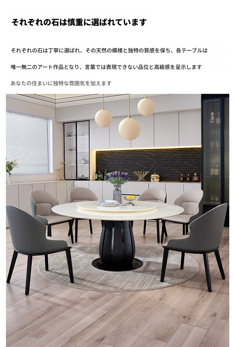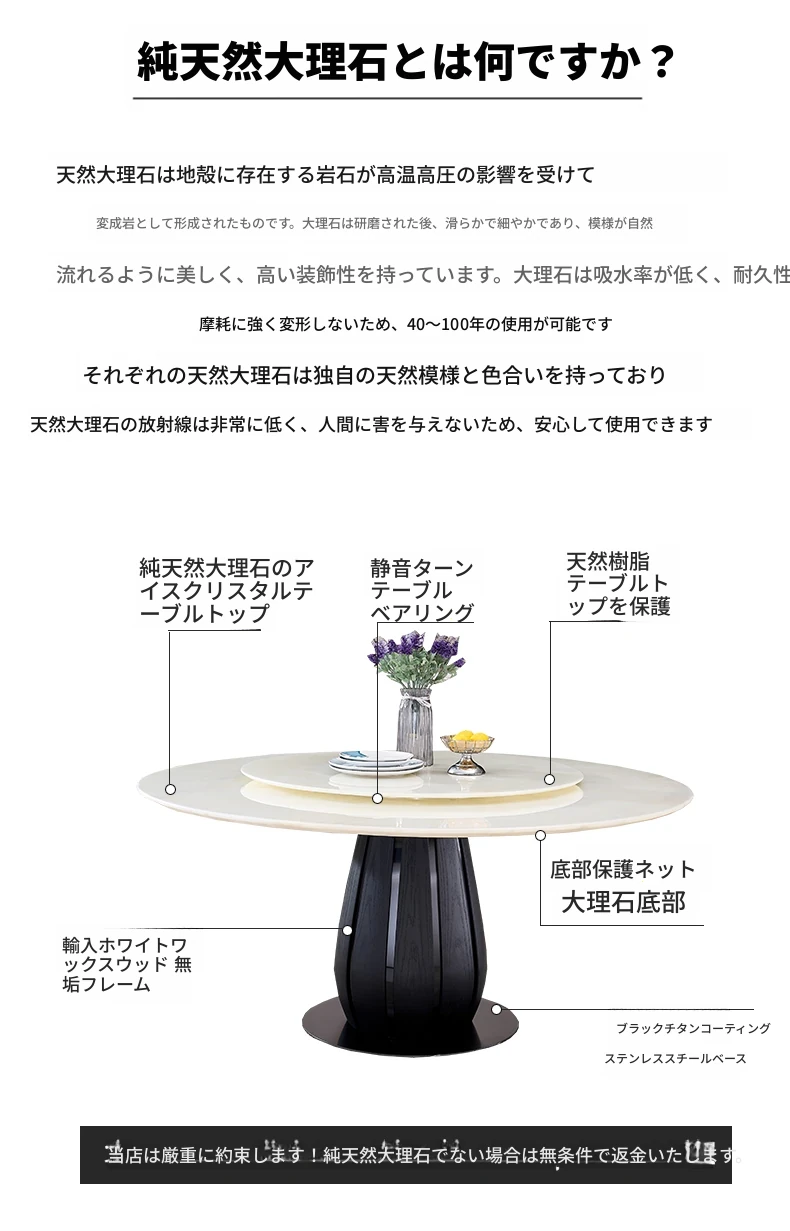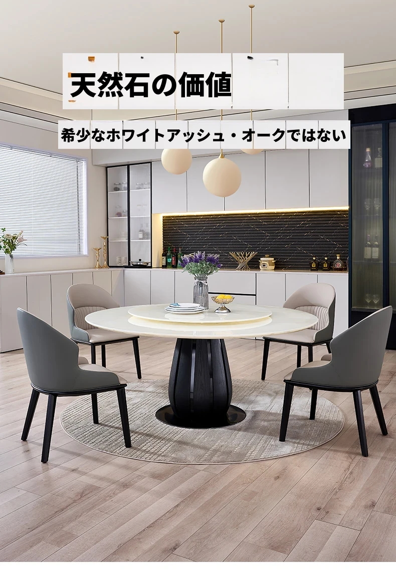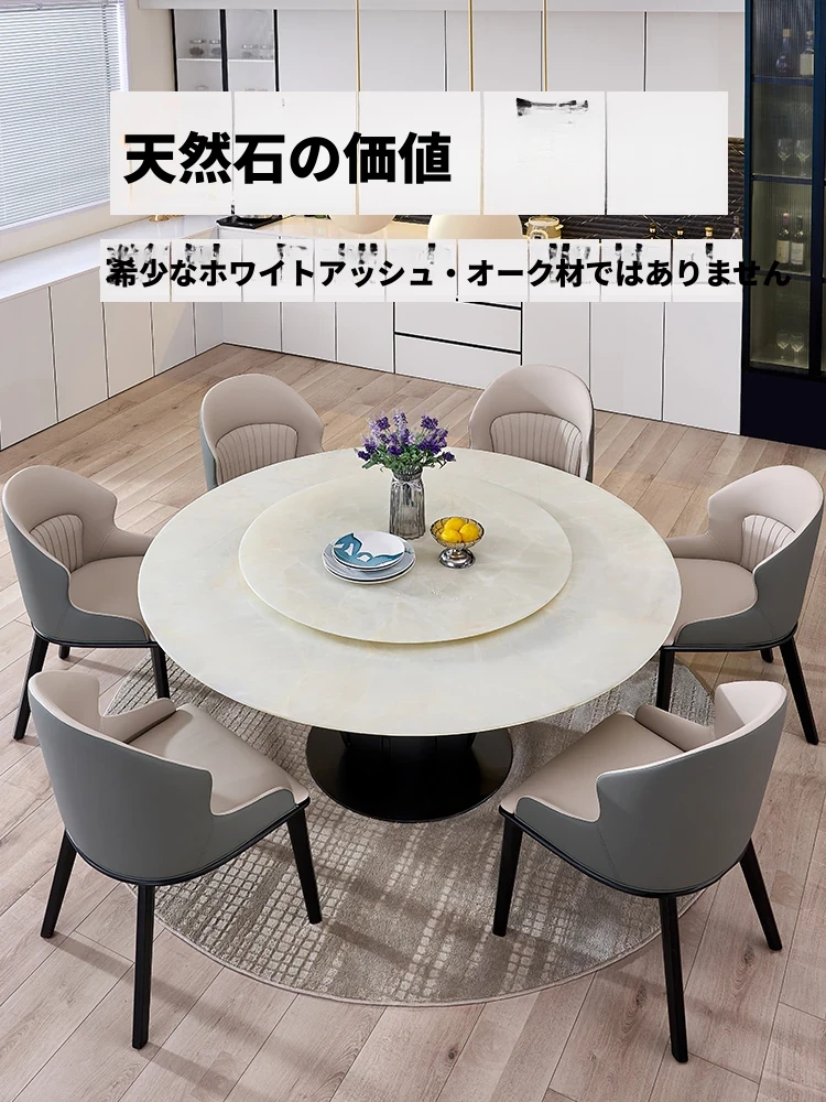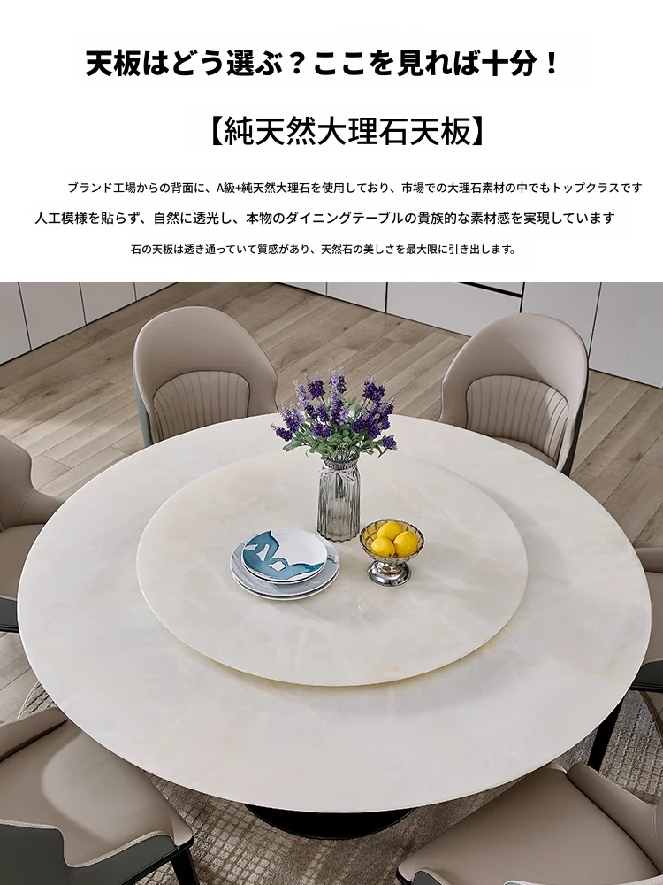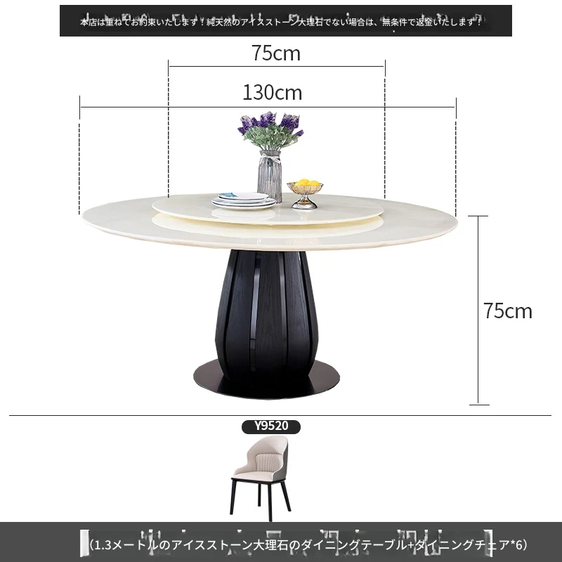 1.2メートル+70cm回転台+ダイニングチェア*6(天然氷玉大理石+ホワイトワックスウッドフレーム+ブラックチタンベース)