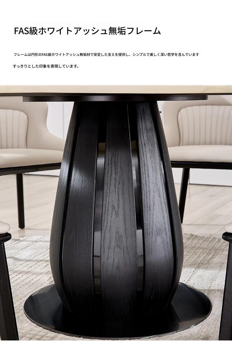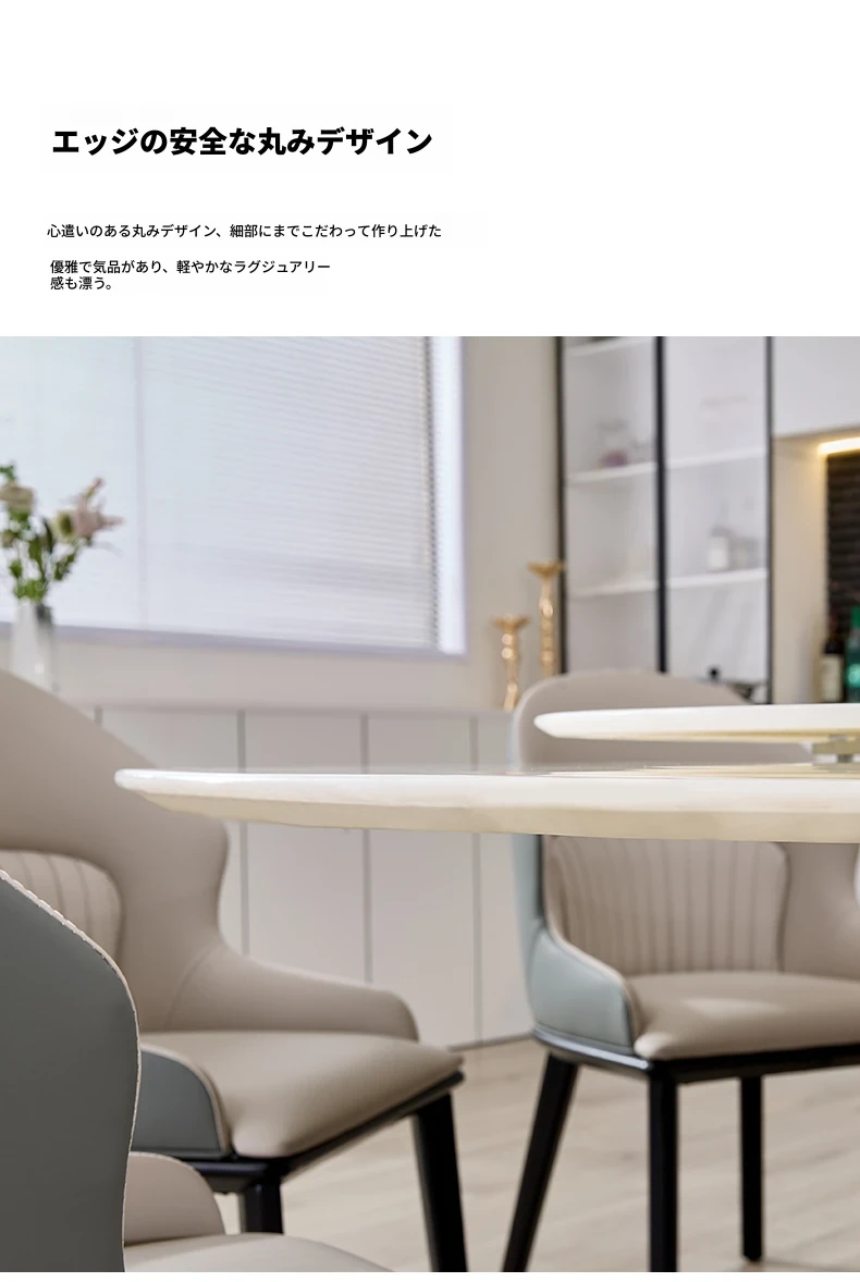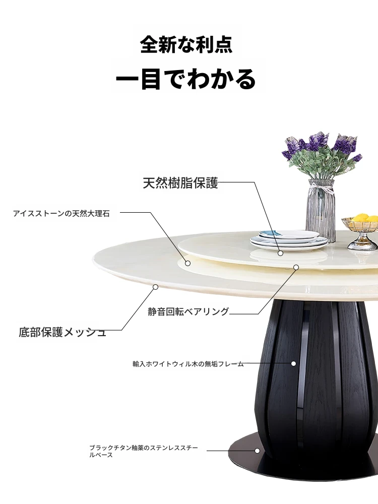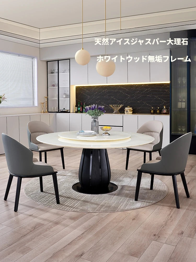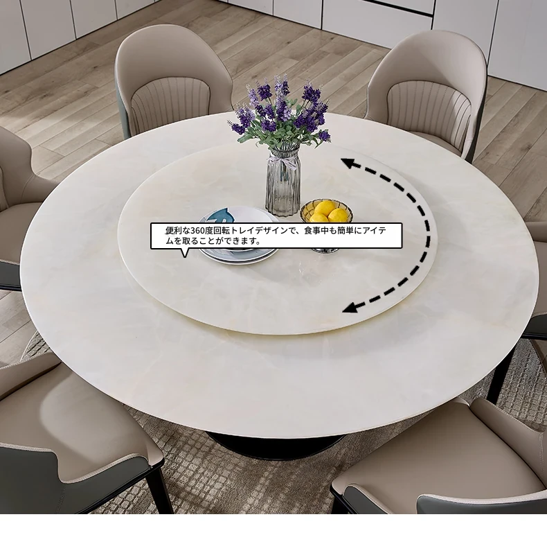 1.2メートル+70cm回転台+ダイニングチェア*6(天然氷玉大理石+ホワイトワックスウッドフレーム+ブラックチタンベース)