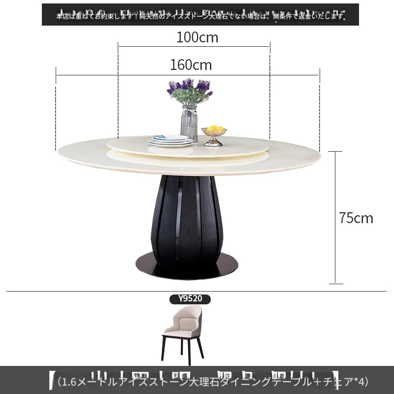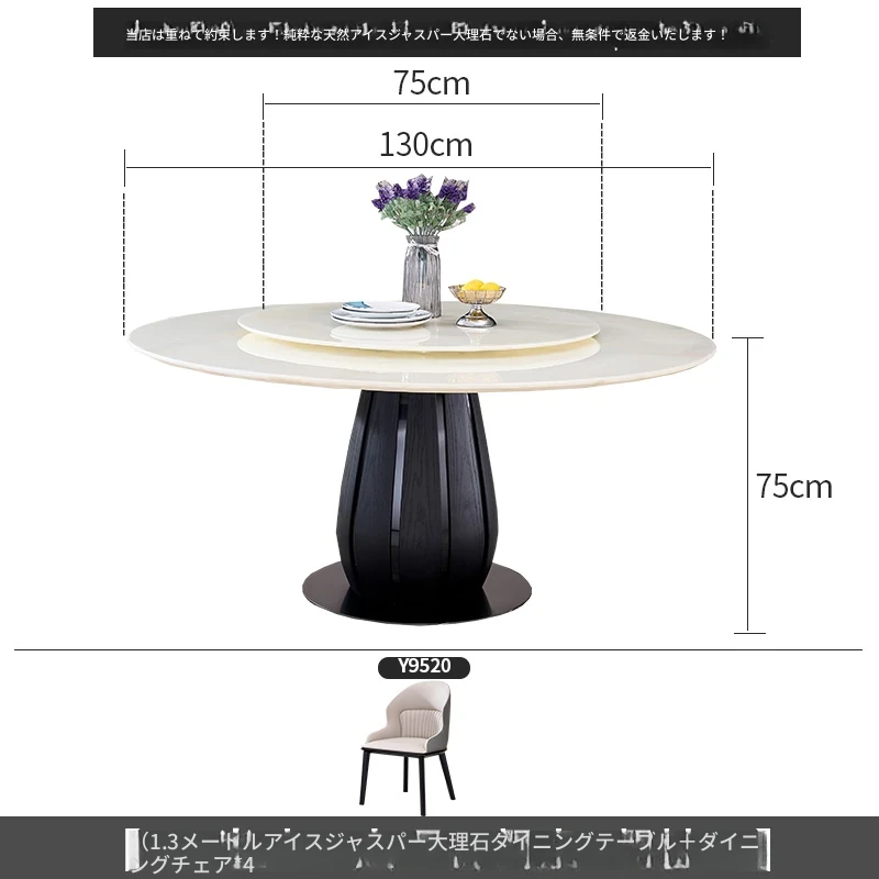 1.2メートル+70cm回転台+ダイニングチェア*4(天然氷玉大理石+ホワイトワックスウッドフレーム+ブラックチタンベース)