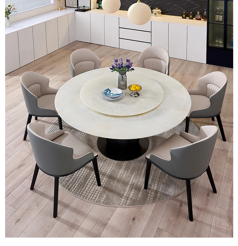 1.6メートル+1メートル回転台+ダイニングチェア*8(天然氷玉大理石+ホワイトワックスウッドフレーム+ブラックチタンベース)