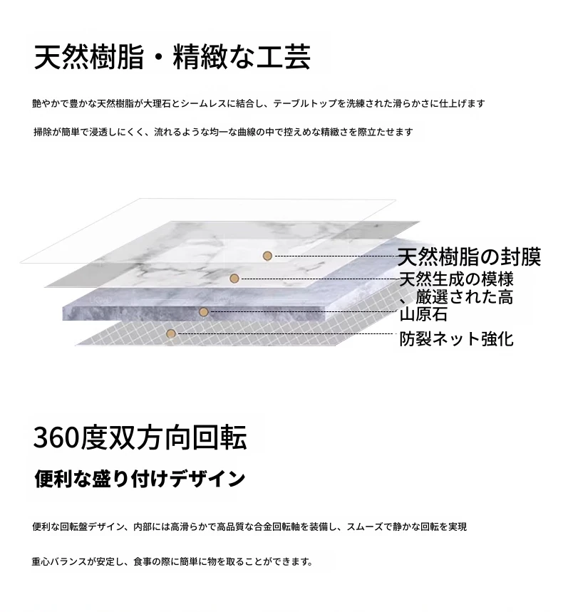 1.6メートル+1メートル回転台+ダイニングチェア*4(天然氷玉大理石+ホワイトワックスウッドフレーム+ブラックチタンベース)