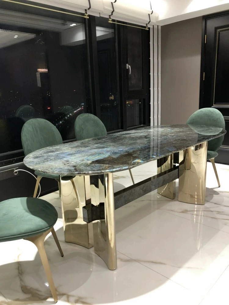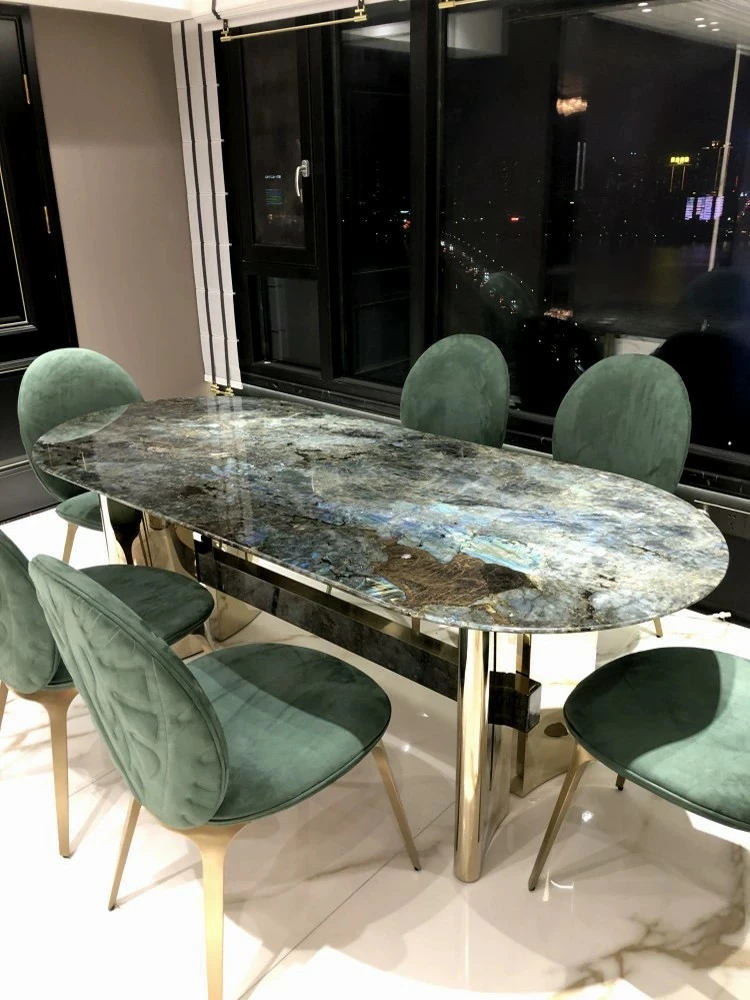 輸入インポートブルージェード高級石材ダイニングテーブル 長方形高級ヴィラ用天然大理石パンドラ・ラグジュアリースタイルダイニングテーブルで、特別なひとときを提供します。