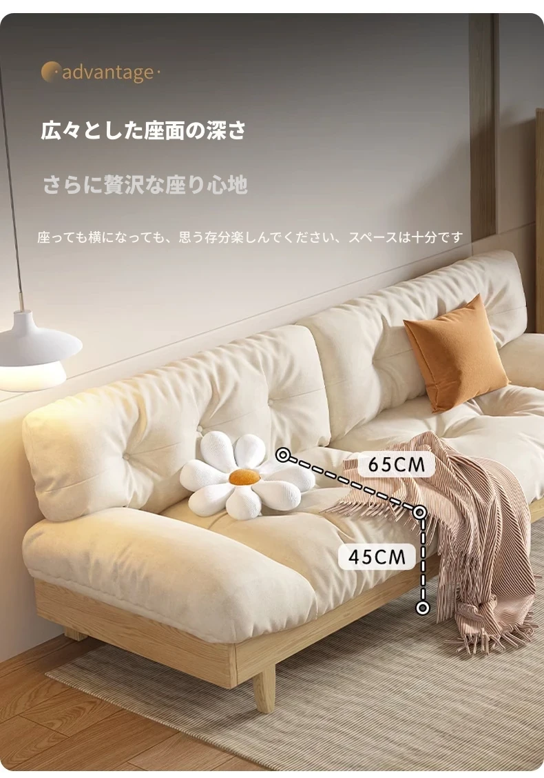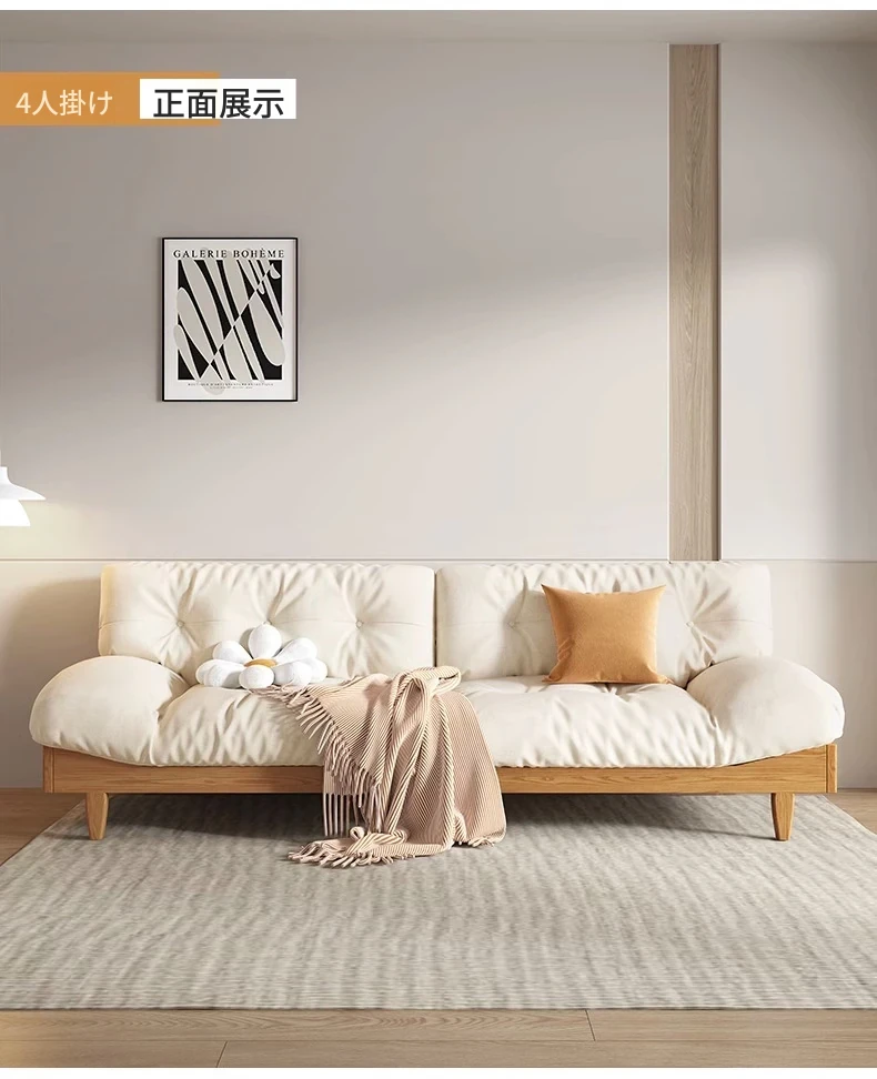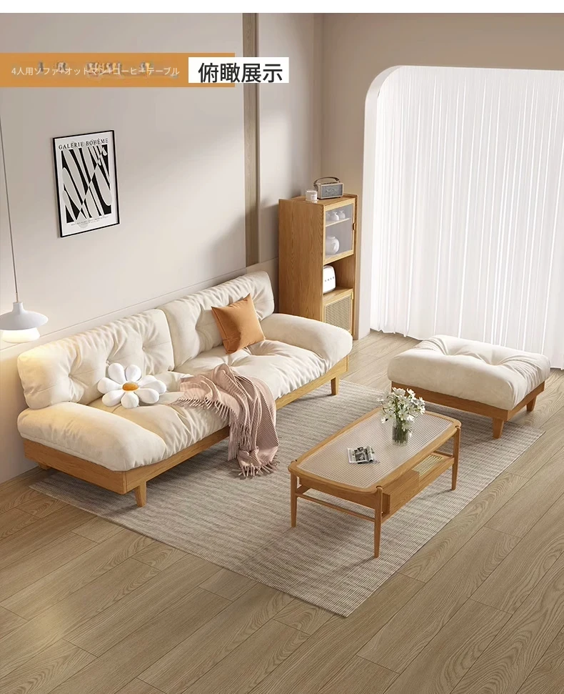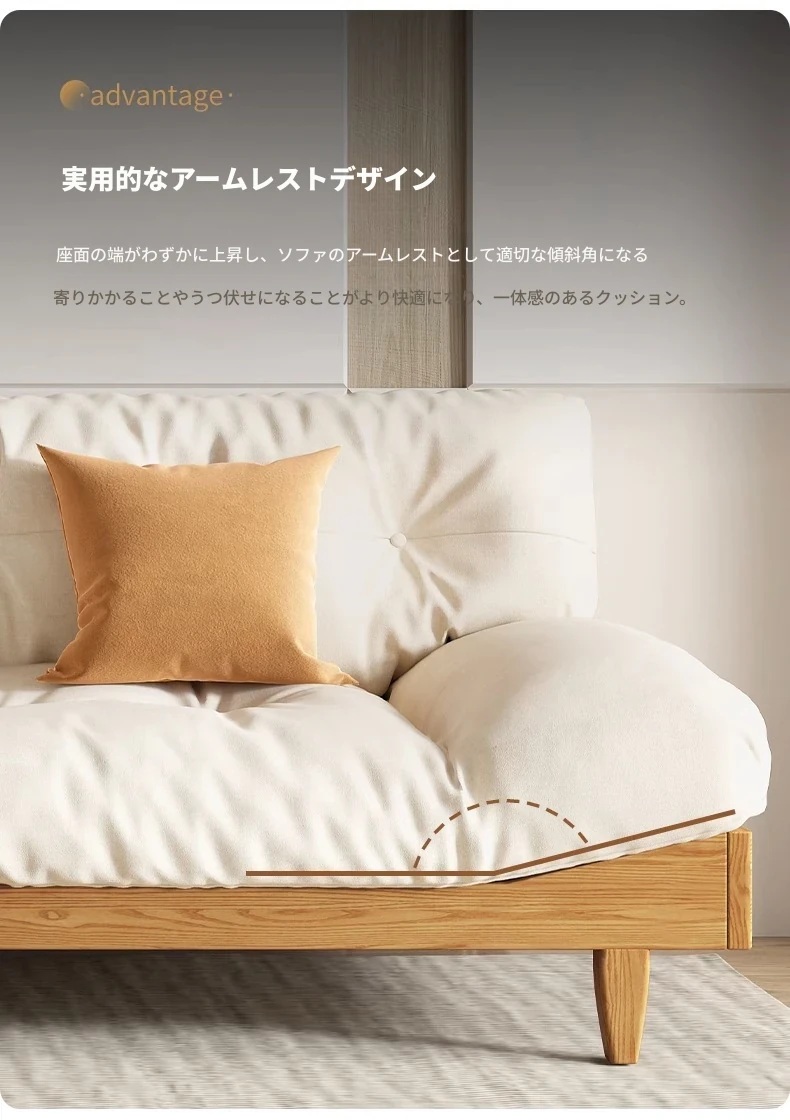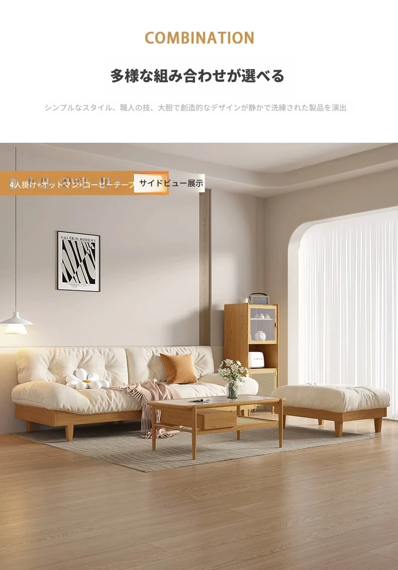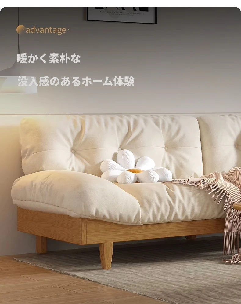 ホワイトアッシュの和風侘び寂びソファ、雲のようなデザインとクリーム色のフロント、テクスチャー豊かなファブリックで心地よい座り心地を実現。洗練されたインテリアにぴったりの一品です。
