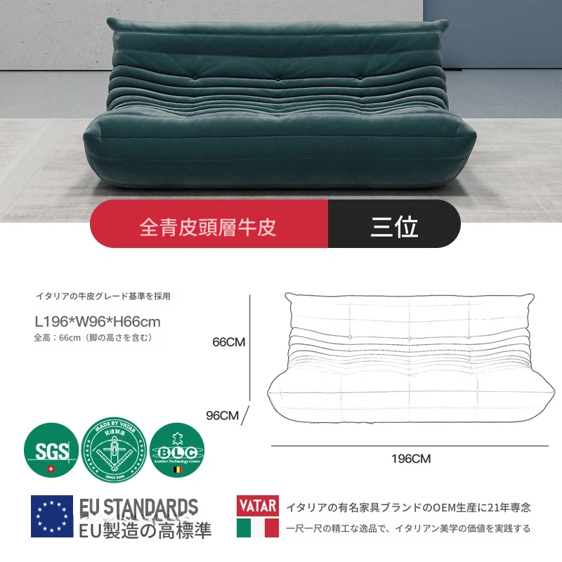 全青牛革-アームレストなしの三人掛け-1.96メートル