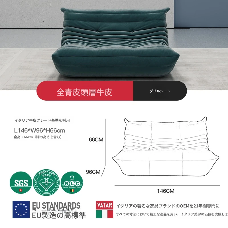 全青牛革-アームレストなしの二人掛け-1.46メートル