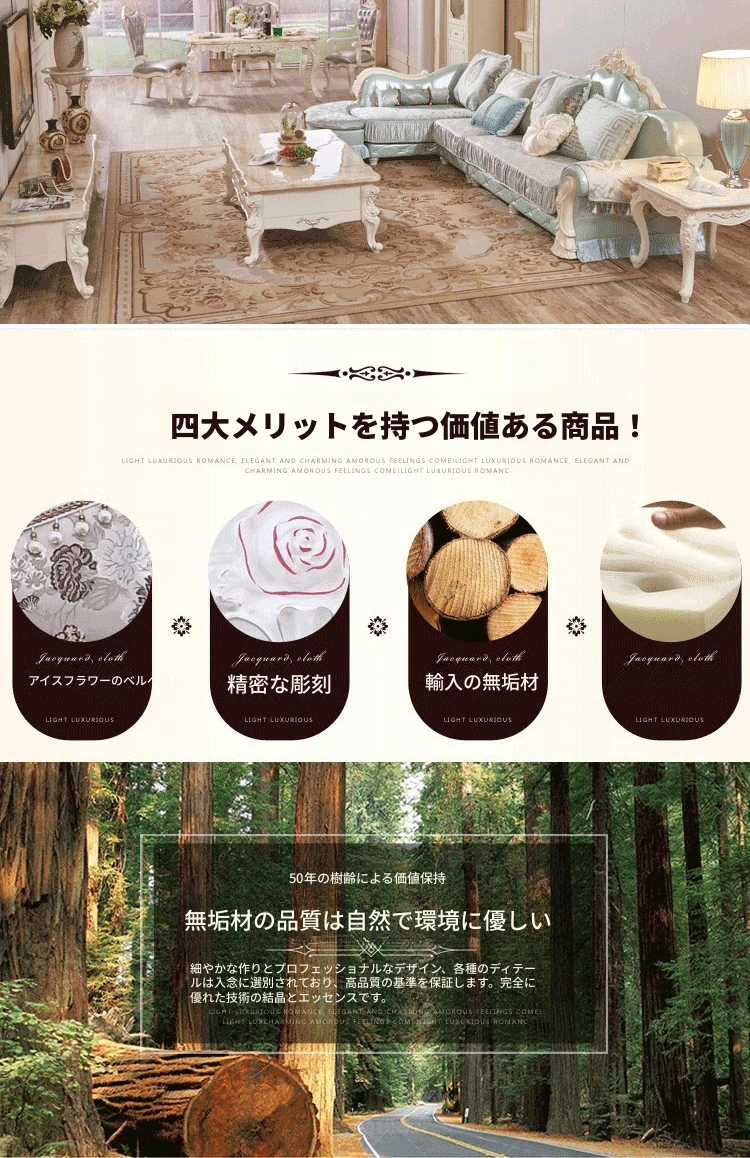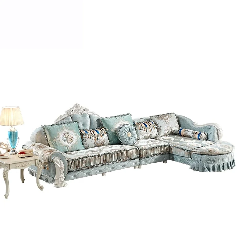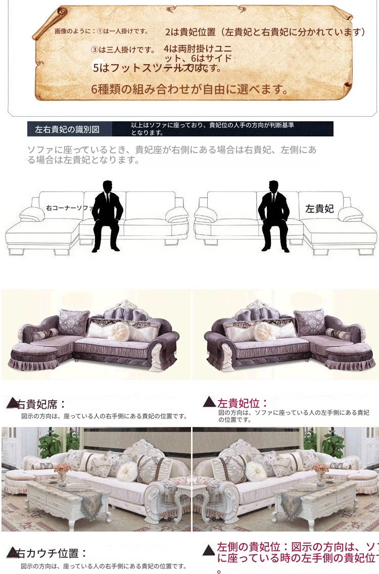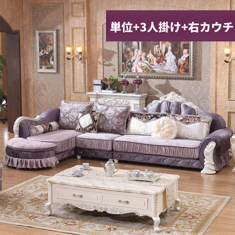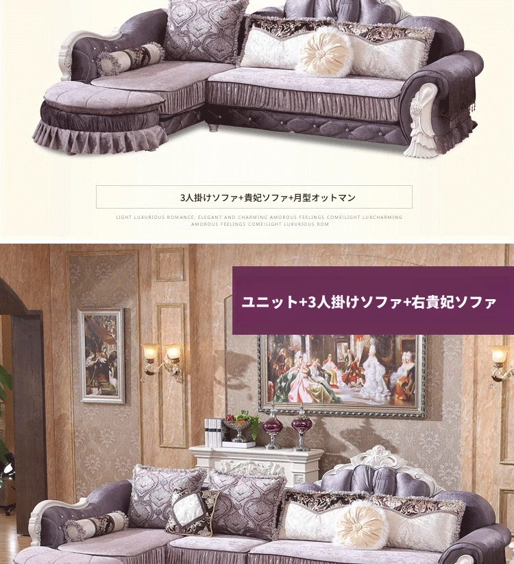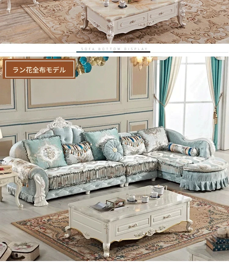 豪華な欧風布製ソファセット L字型&貴妃ソファ - 大小様々なリビングに最適!彫刻木材使用、エレガントな宮廷スタイルで、シンプルな欧風デザインが魅力的。あなたの空間をより特別に演出します!