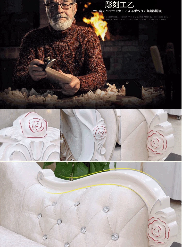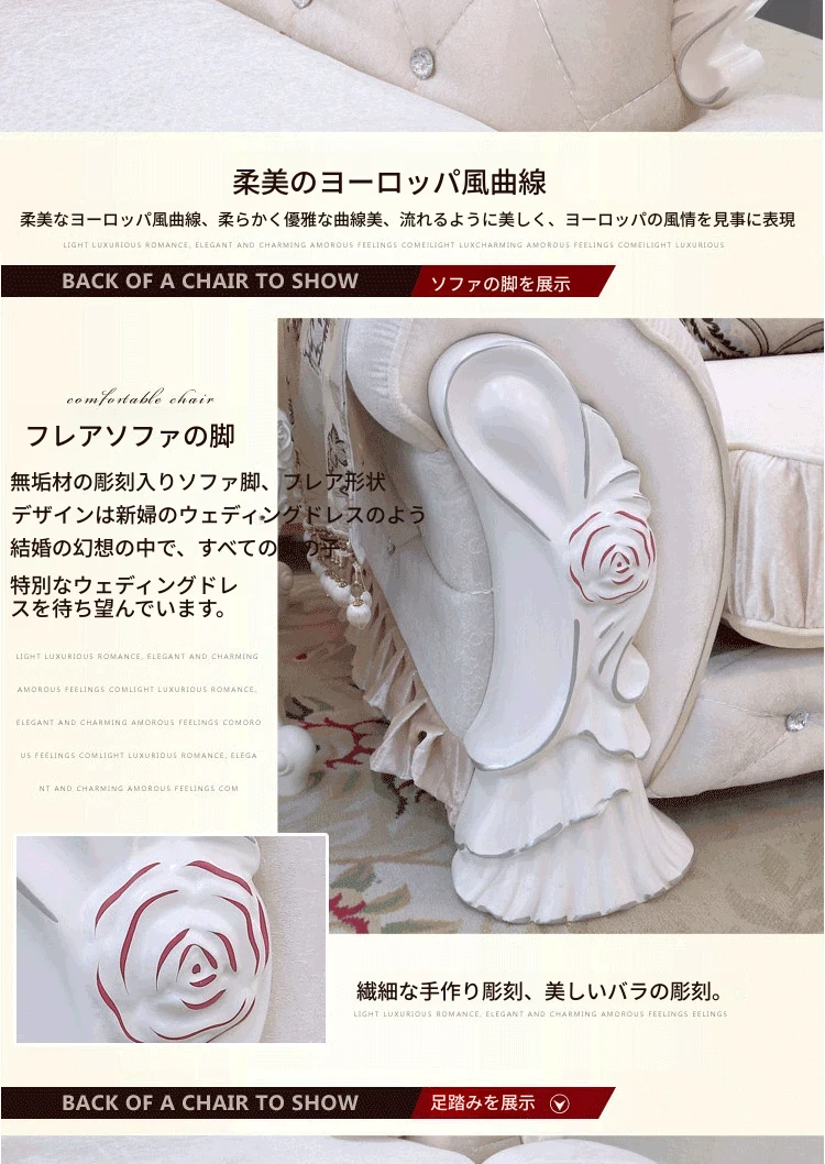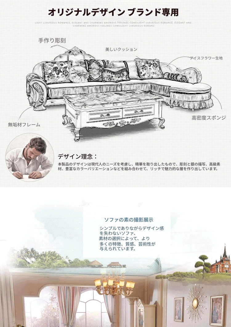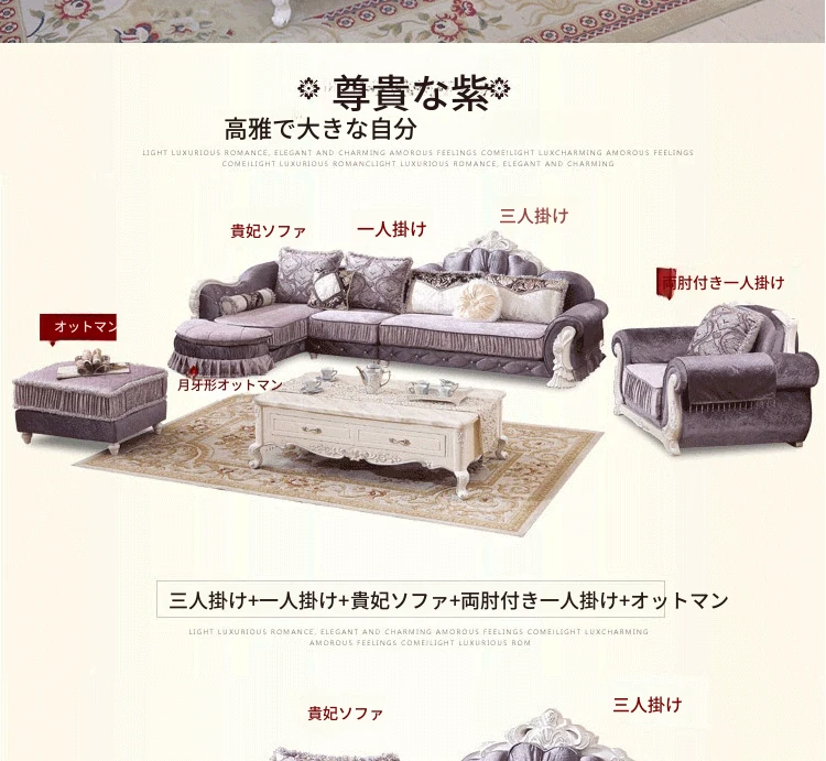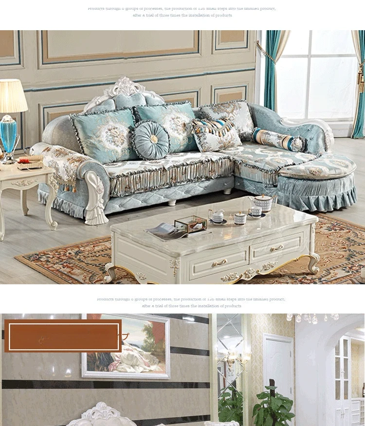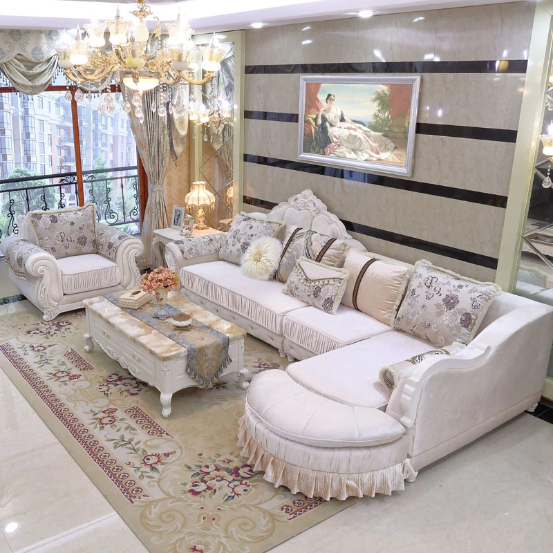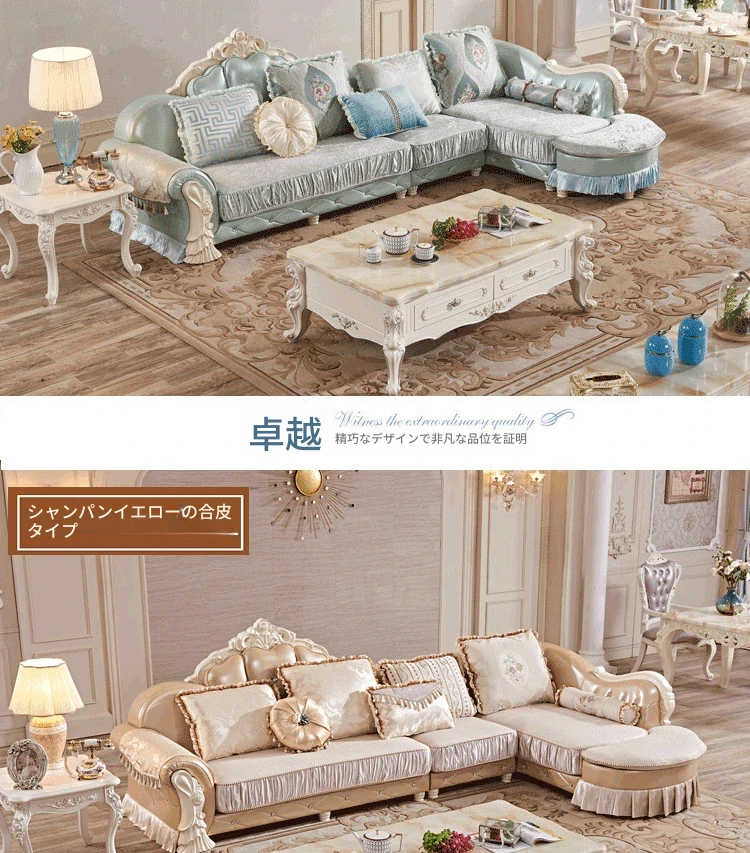 豪華な欧風布製ソファセット L字型&貴妃ソファ - 大小様々なリビングに最適!彫刻木材使用、エレガントな宮廷スタイルで、シンプルな欧風デザインが魅力的。あなたの空間をより特別に演出します!