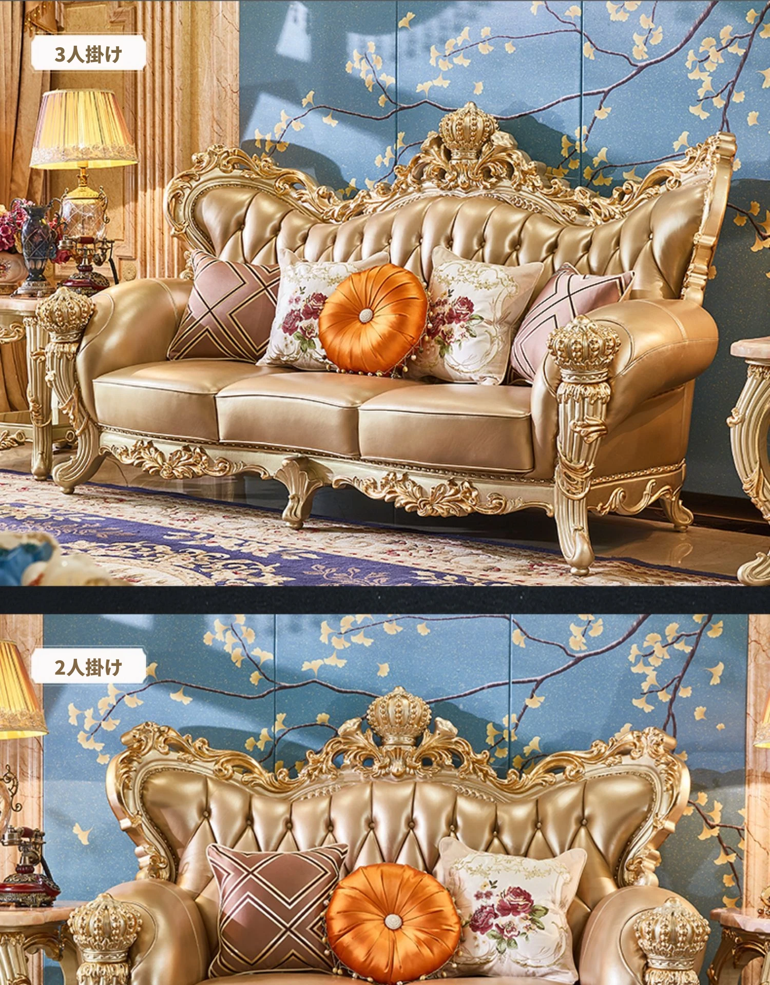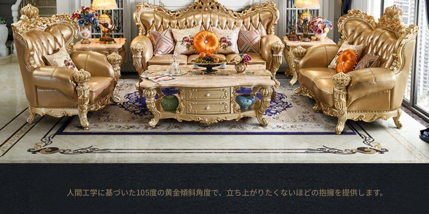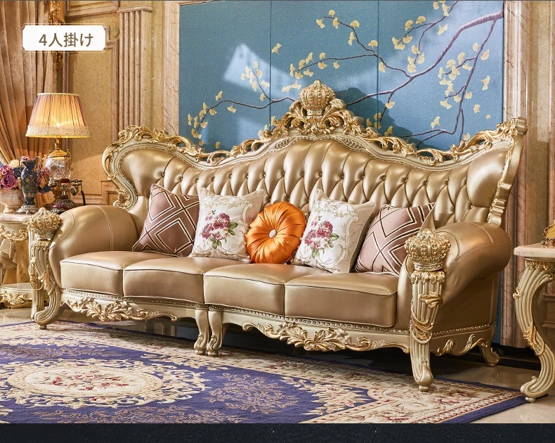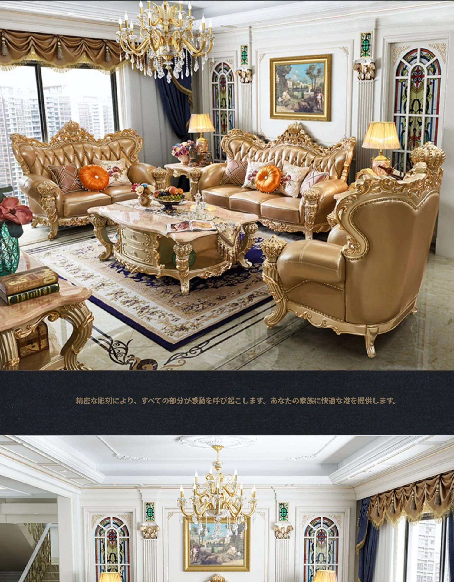 エレガントなヨーロピアンスタイルの豪華な本革ソファセット 2022年新作 高級感あふれる彫刻デザインのクラウン付きリビングルーム用豪華家具で、居心地良い空間を演出します。