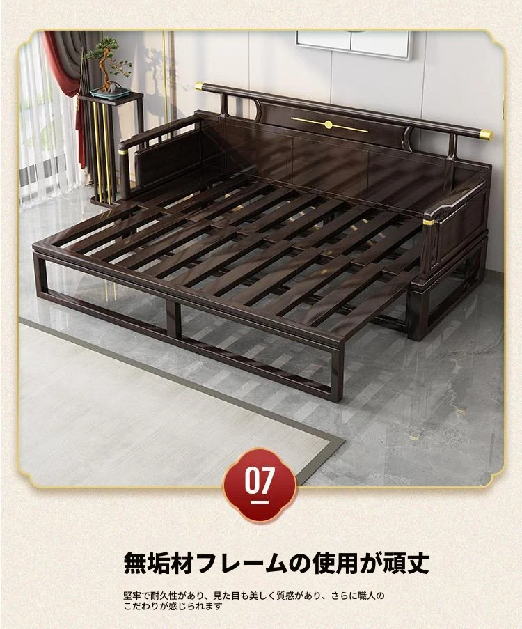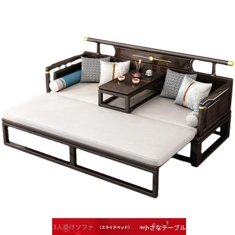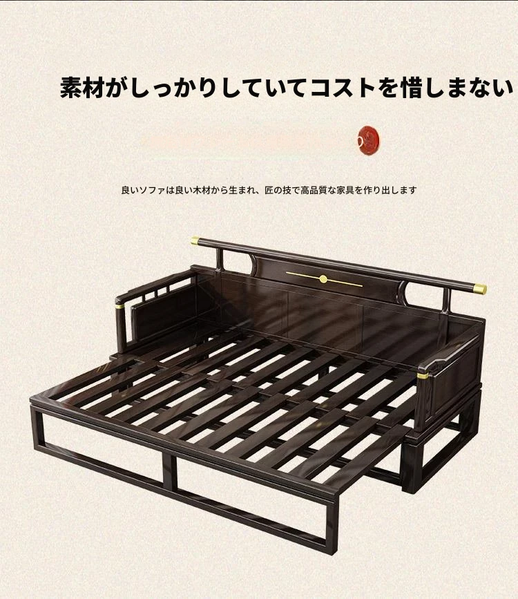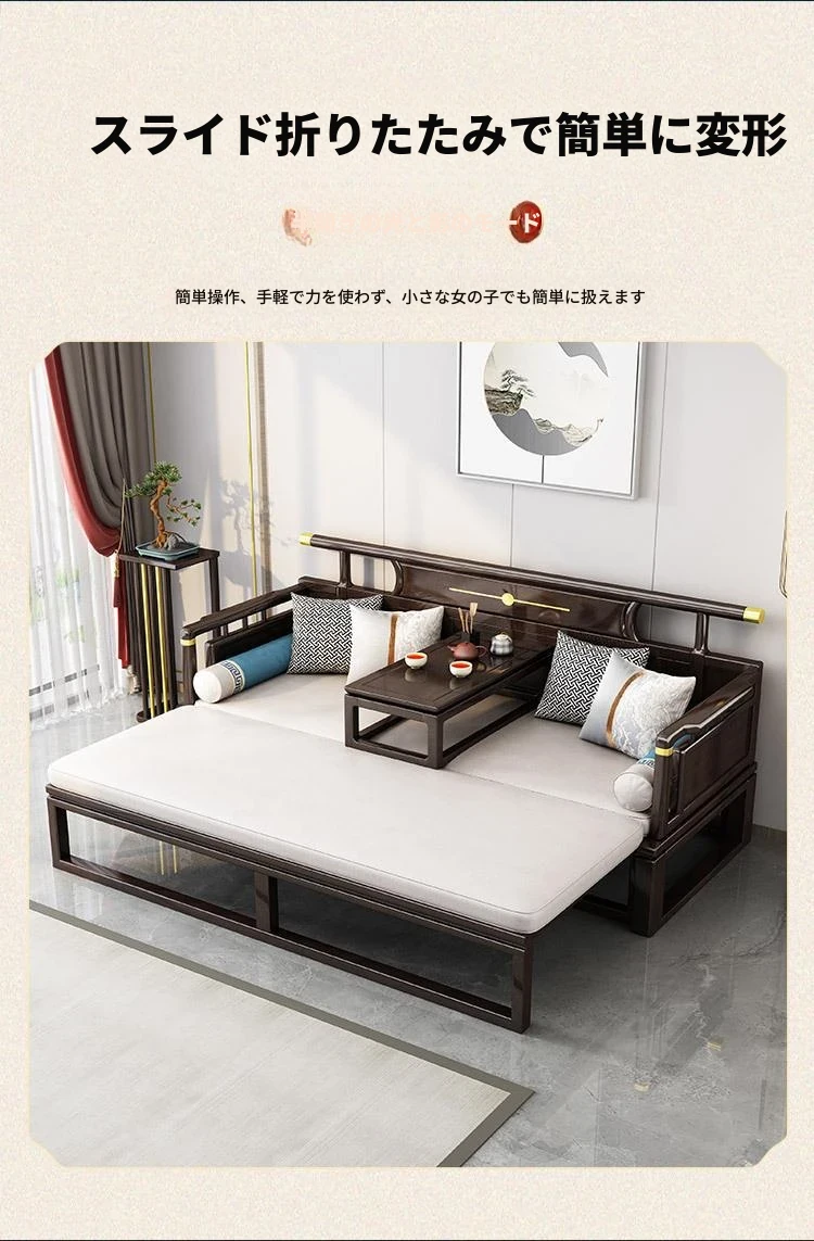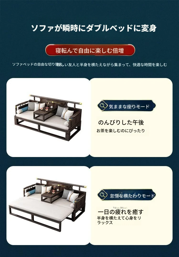 現代新中式の無垢材ローハンソファベッド - シンプルでスタイリッシュな小型リビングに最適!引き出し式の多機能ベッドで、快適な寝心地とおしゃれな空間を実現。ローハンベッドでリラックスしたひとときをお楽しみください。