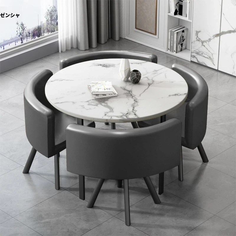 擬似石模様の円形 + 灰色の皮製椅子 1テーブル4椅子 80*80