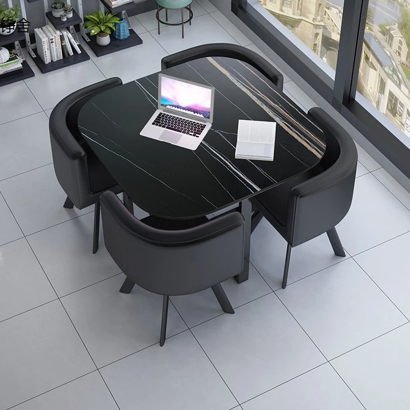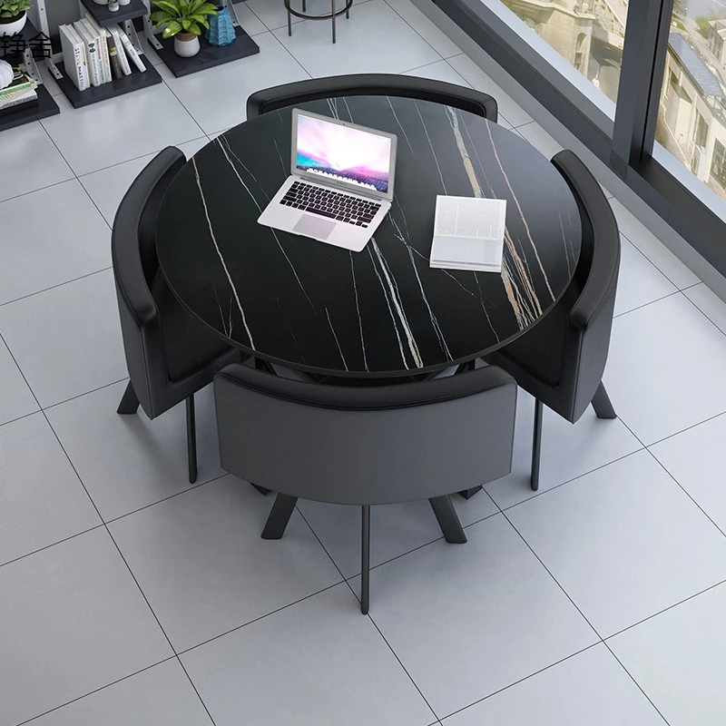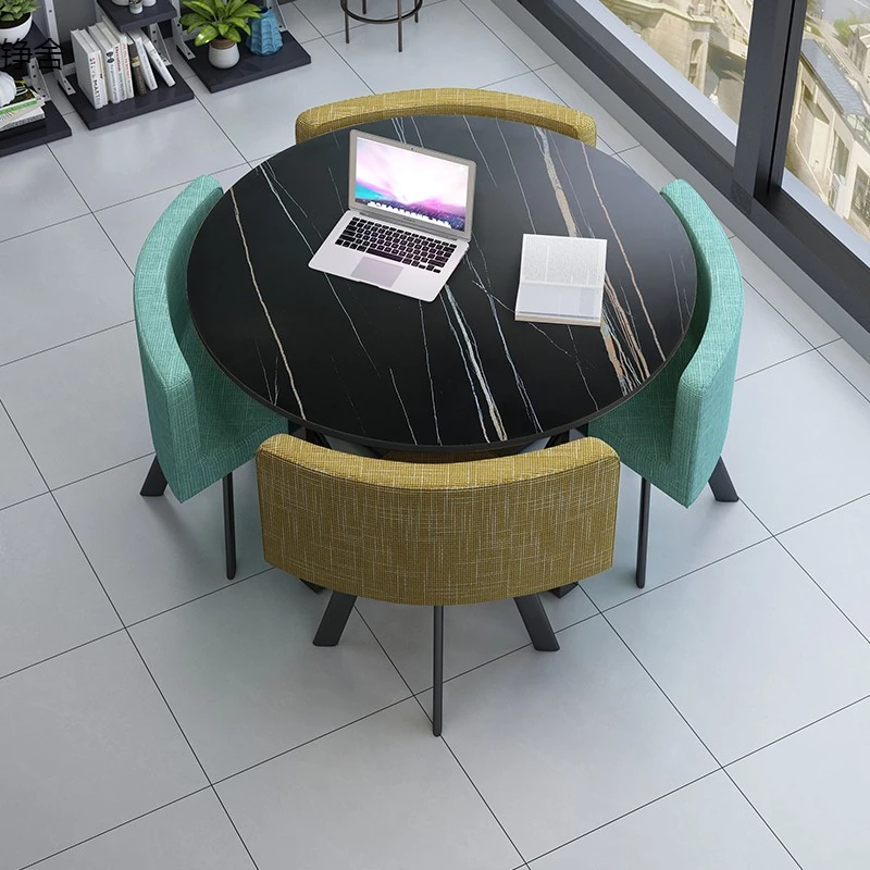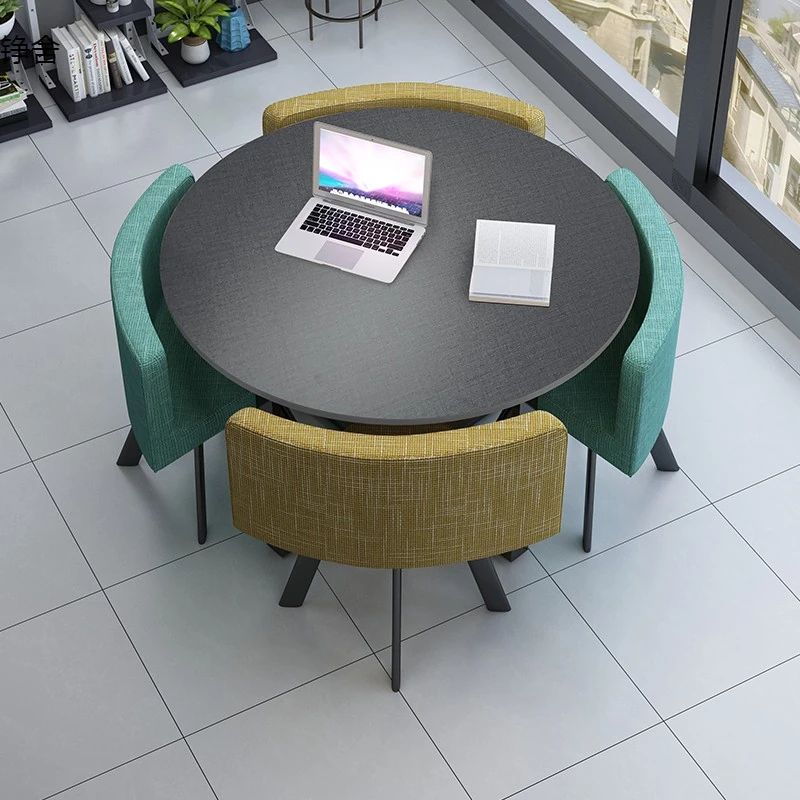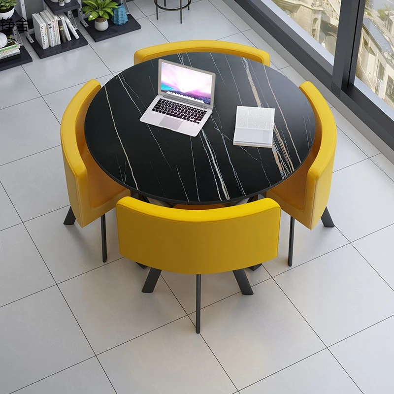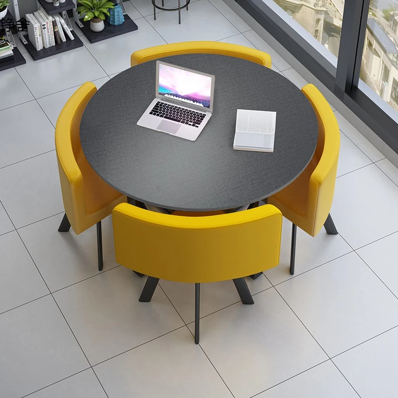 おしゃれで機能的な商談テーブルセット|オフィスやリラックス空間に最適な小丸テーブルと四角いダイニングテーブルのシンプルな接待デスク&チェアの組み合わせ!