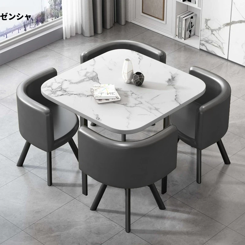 擬似石模様の四角形 + 灰色の皮製椅子 1テーブル4椅子 80*80