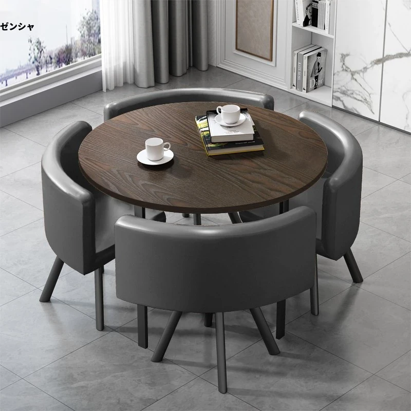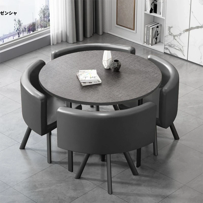 灰色の円形テーブル + 灰色の皮製椅子 1テーブル4椅子 80*80