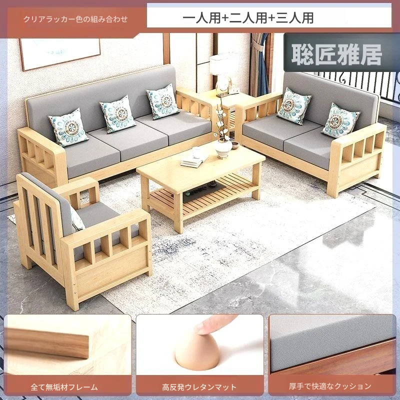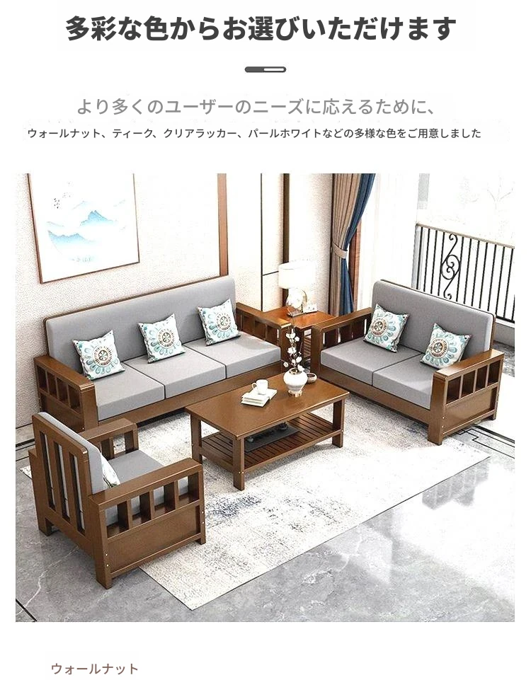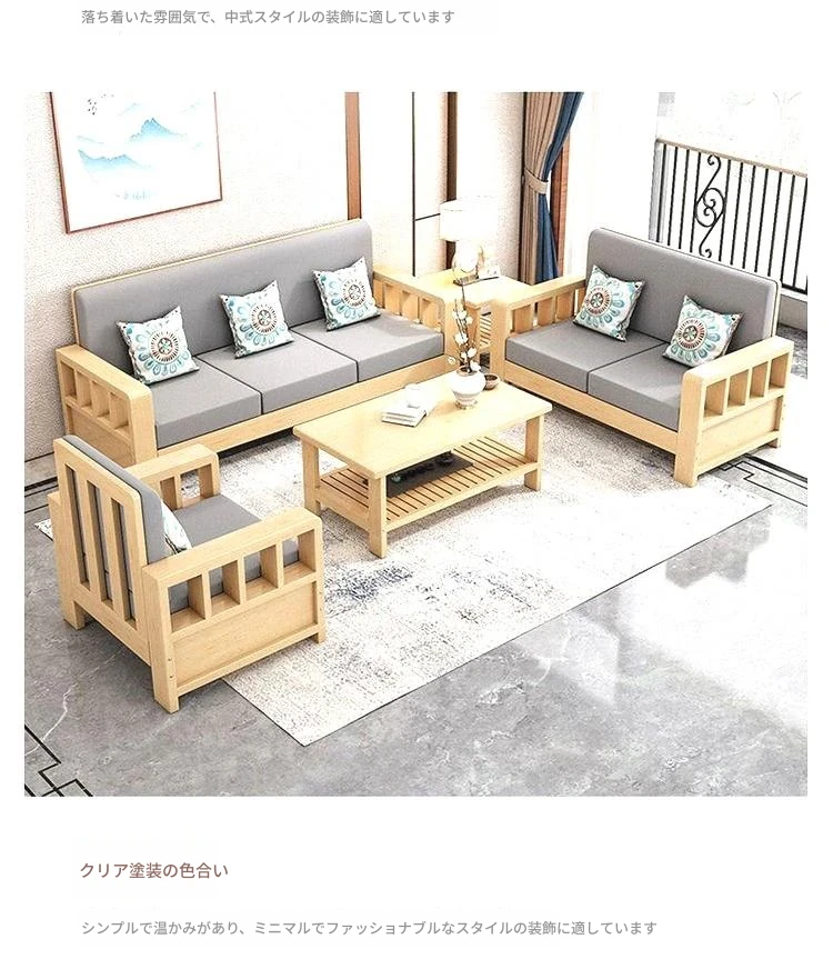 【セット】1+2+3人用ソファ+サイドテーブル/透明なクリアラッカー色【本物の木にクッションと抱き枕付き】