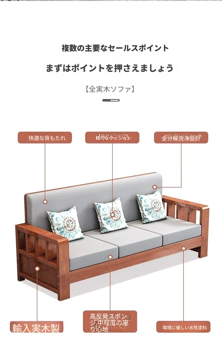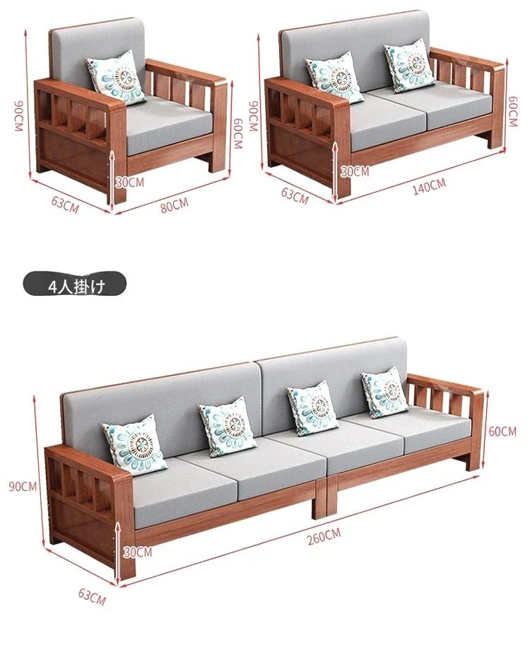 【4人用】ソファ2.6m/透明なクリアラッカー色【本物の木にクッションと抱き枕付き】