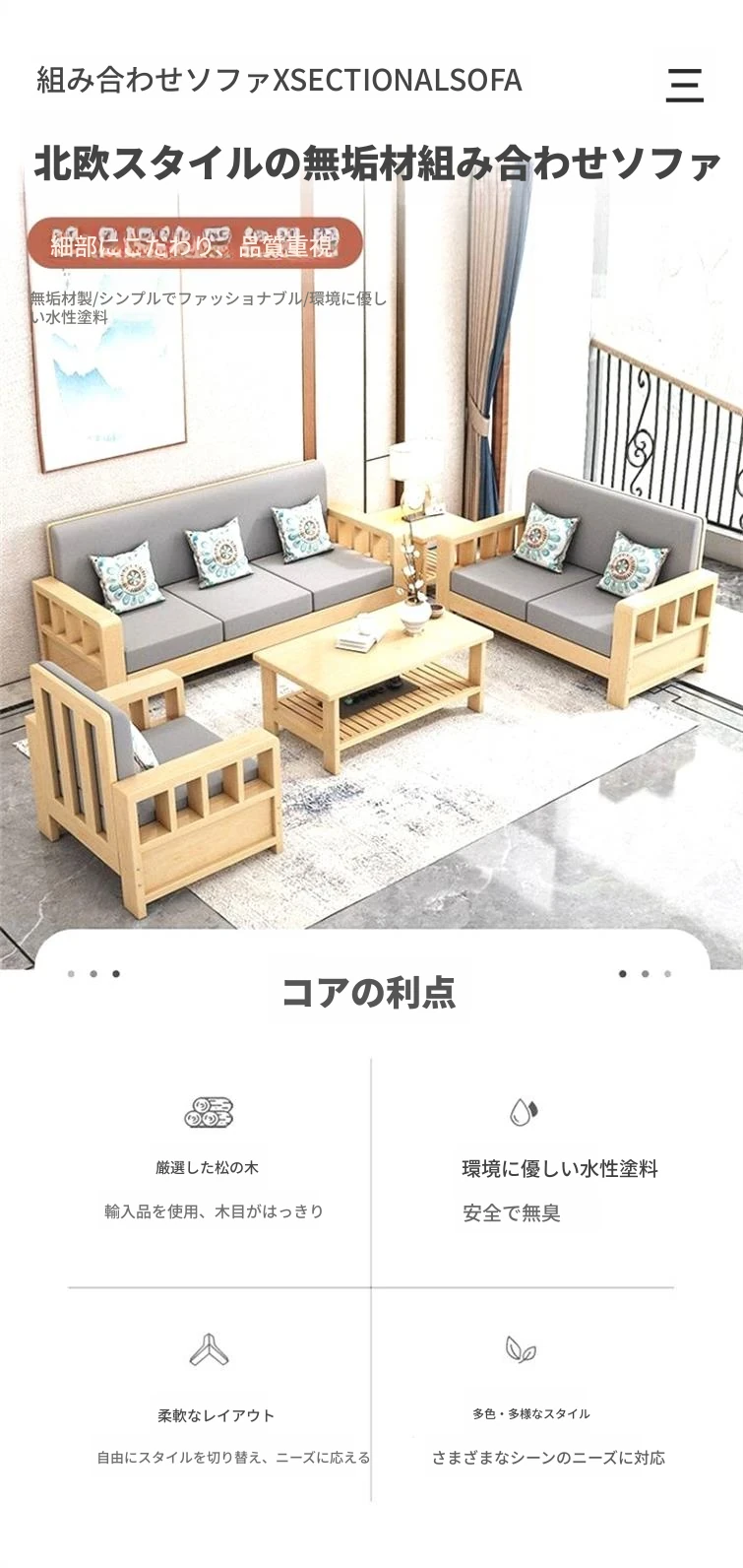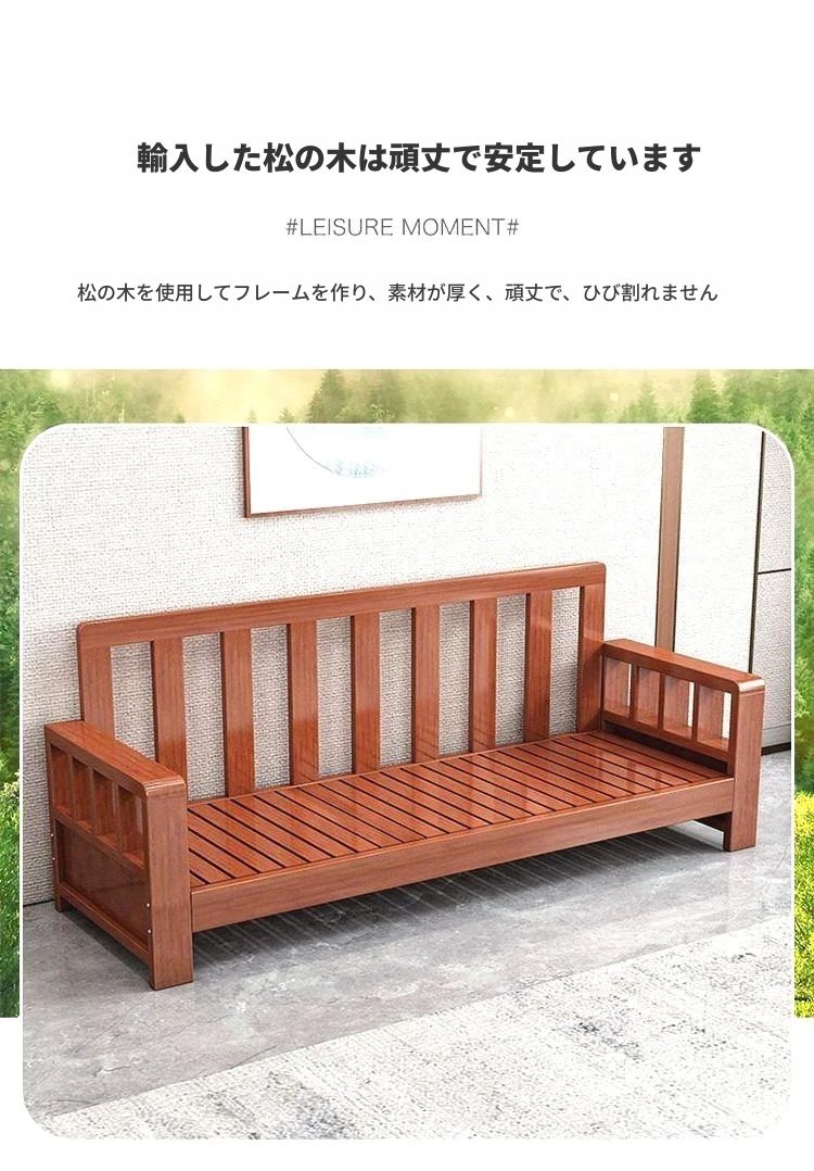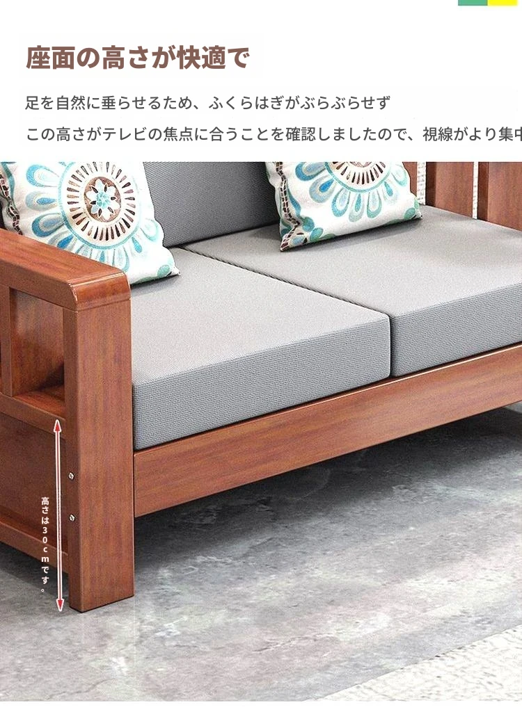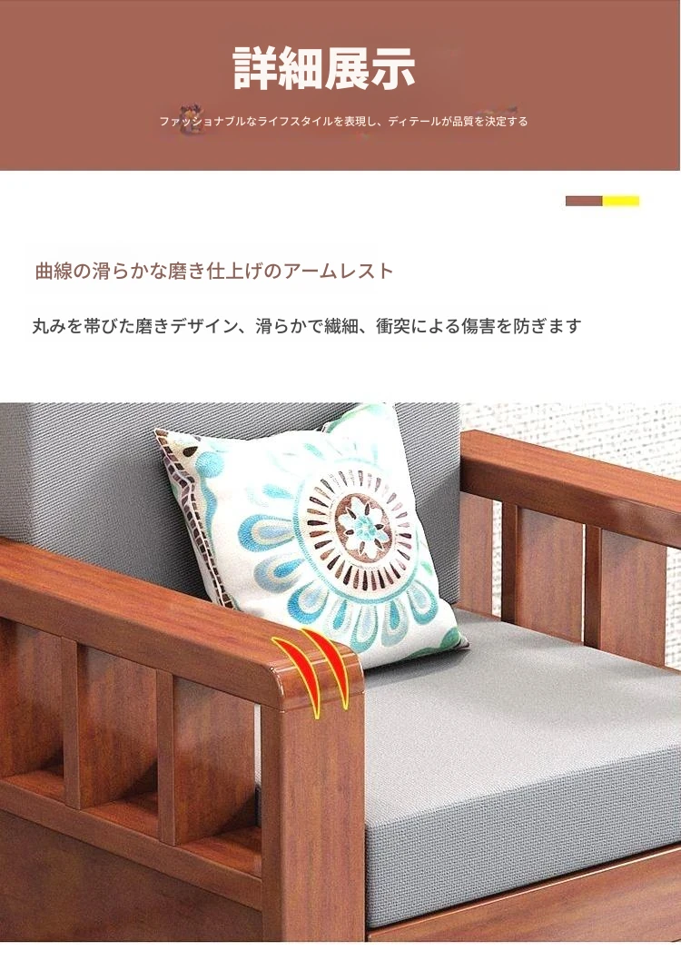 【4人用】ソファ2.6m/高級ユズ木色【本物の木にクッションと抱き枕付き】