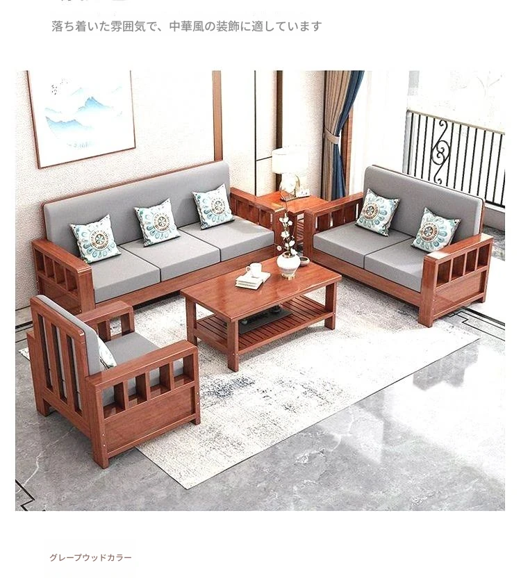 【セット】1+2+3人用ソファ+テーブル+サイドテーブル/高級ユズ木色【本物の木にクッションと抱き枕付き】