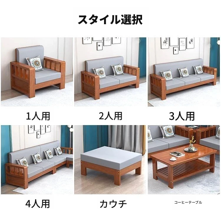 【4人用】ソファ+カウチ/透明なクリアラッカー色【本物の木にクッションと抱き枕付き】