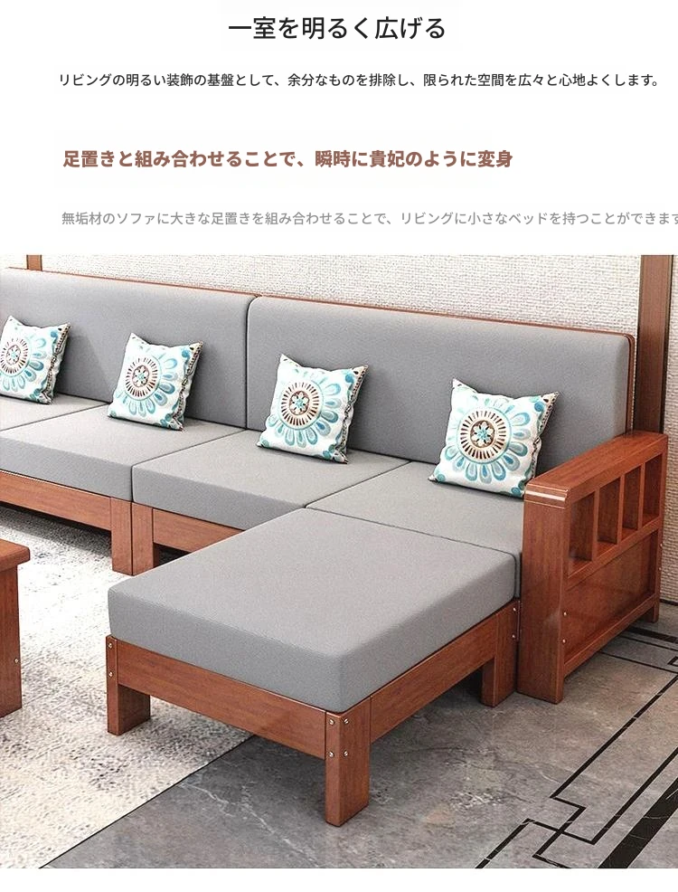 【4人用】ソファ+カウチ/高級ユズ木色【本物の木にクッションと抱き枕付き】