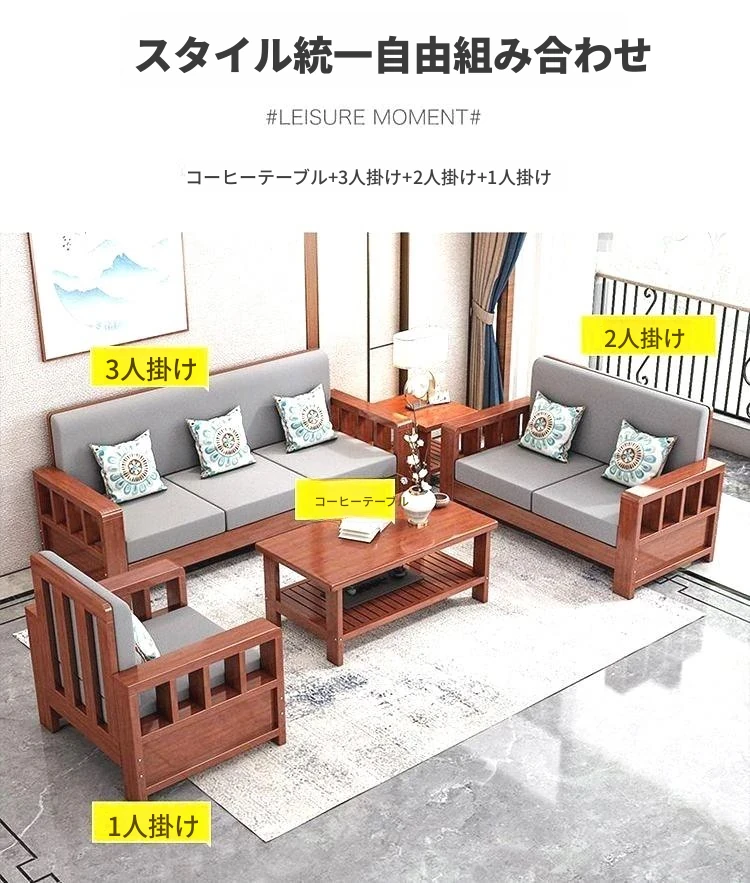 【セット】1+2+3人用ソファ/高級ユズ木色【本物の木にクッションと抱き枕付き】