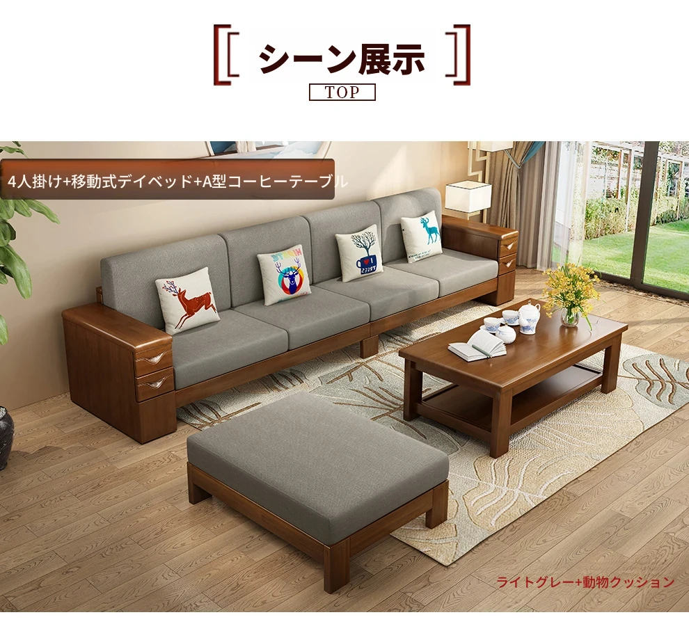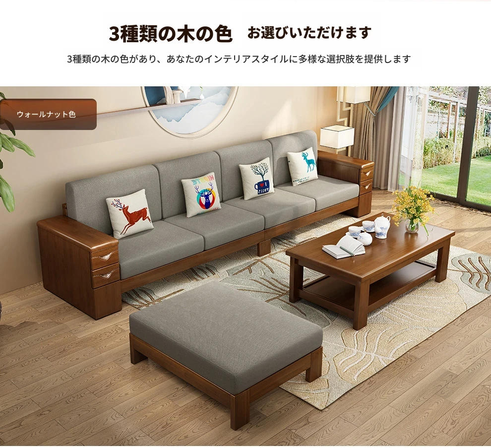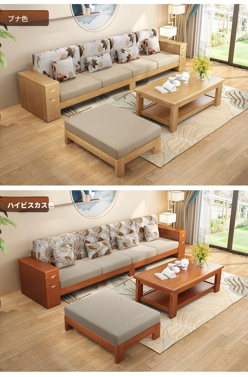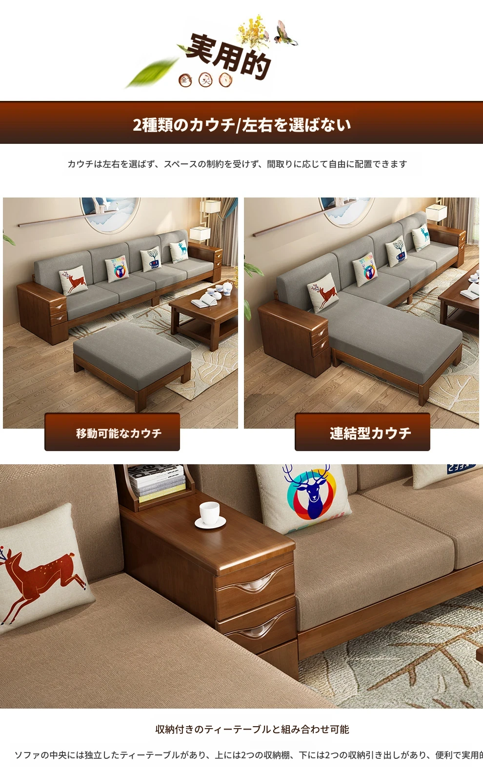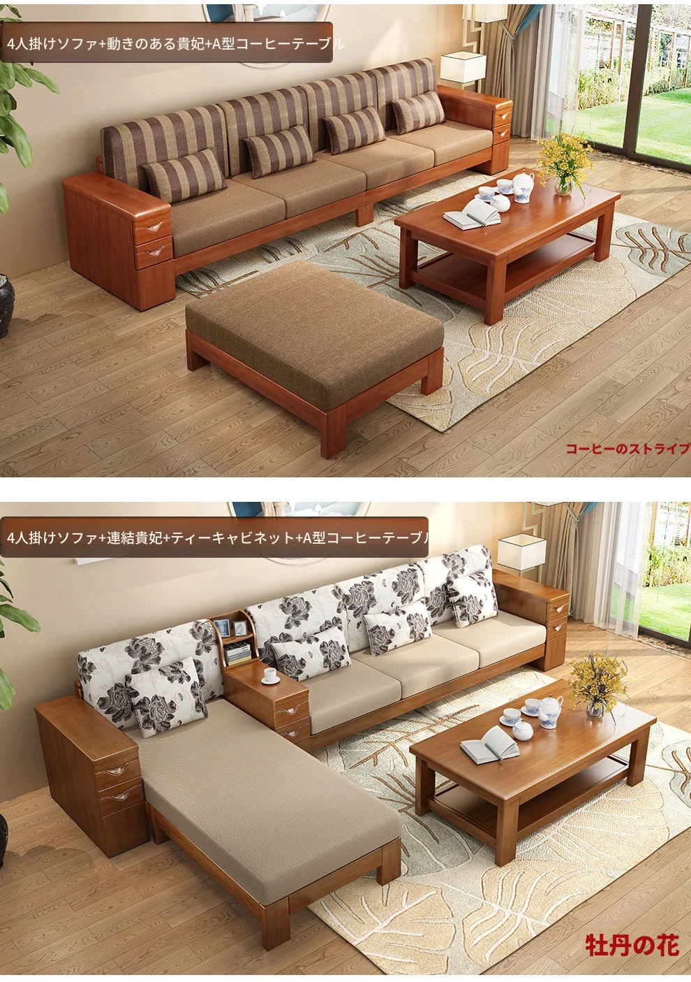 天然木材使用の全実木リビングソファセット!七字型のコーナーにぴったりな中華風デザイン。布張りで快適、茶卓とテレビ台付きの高品質ラバーウッド家具。心地よい空間を演出します!